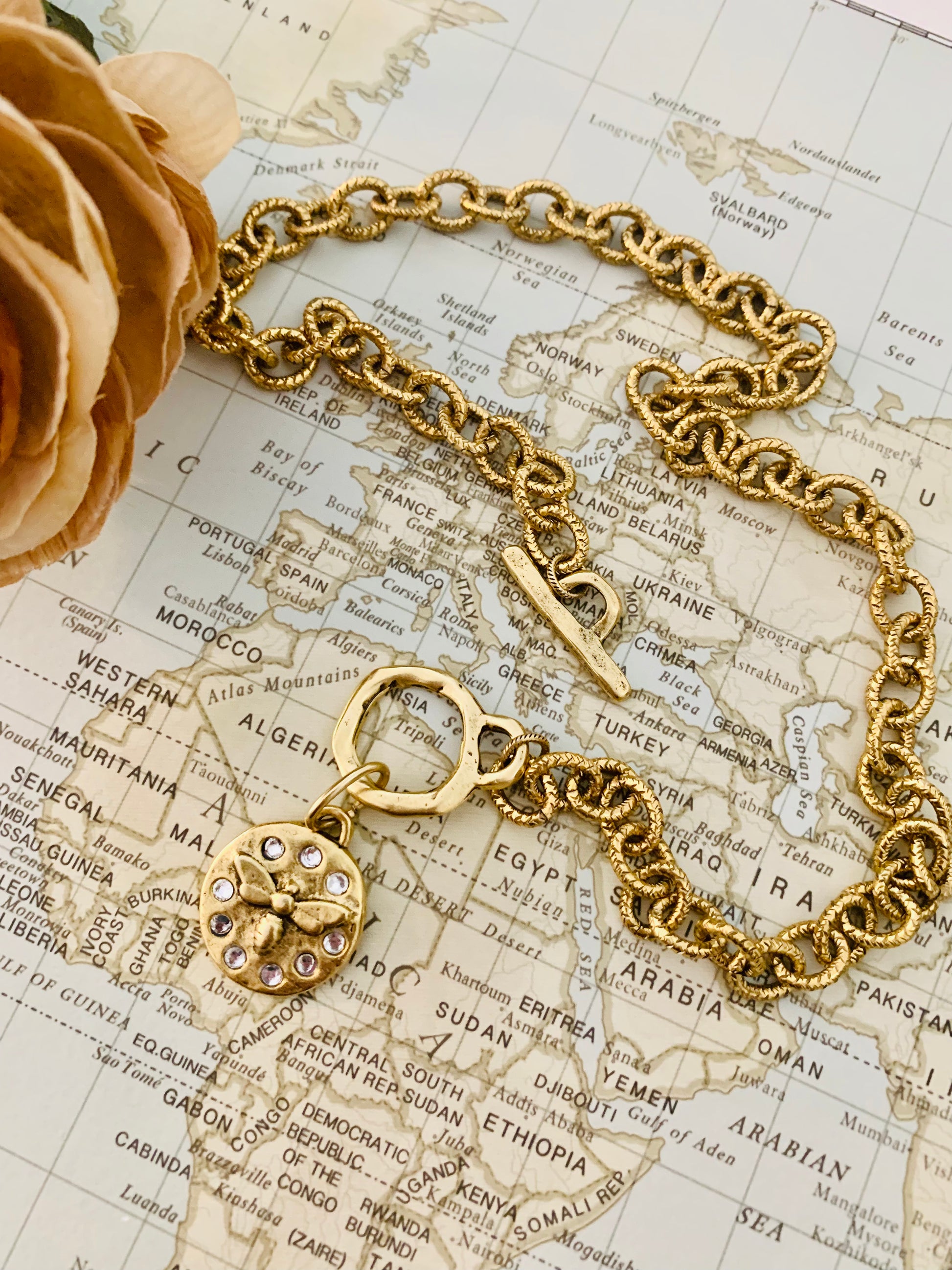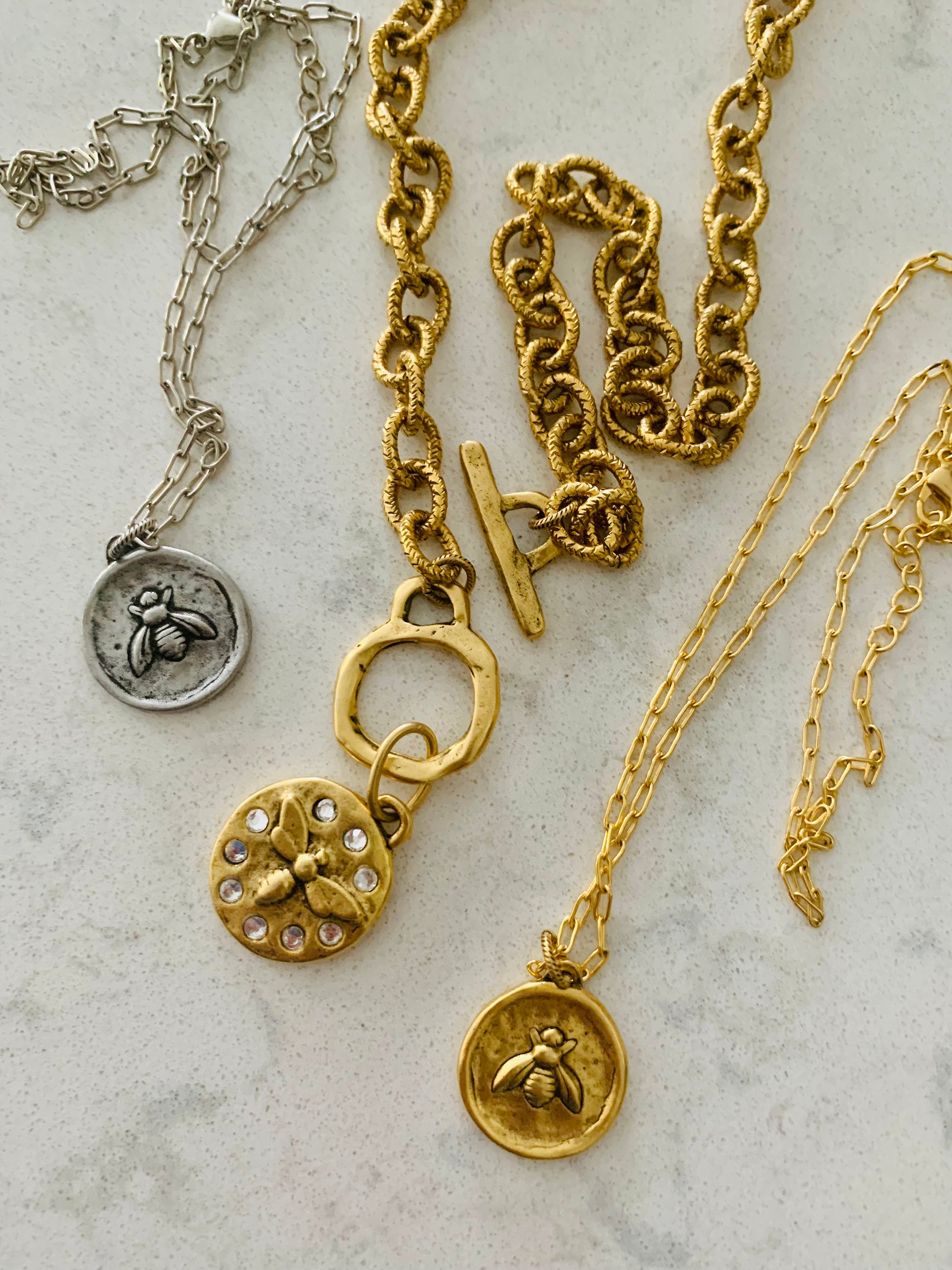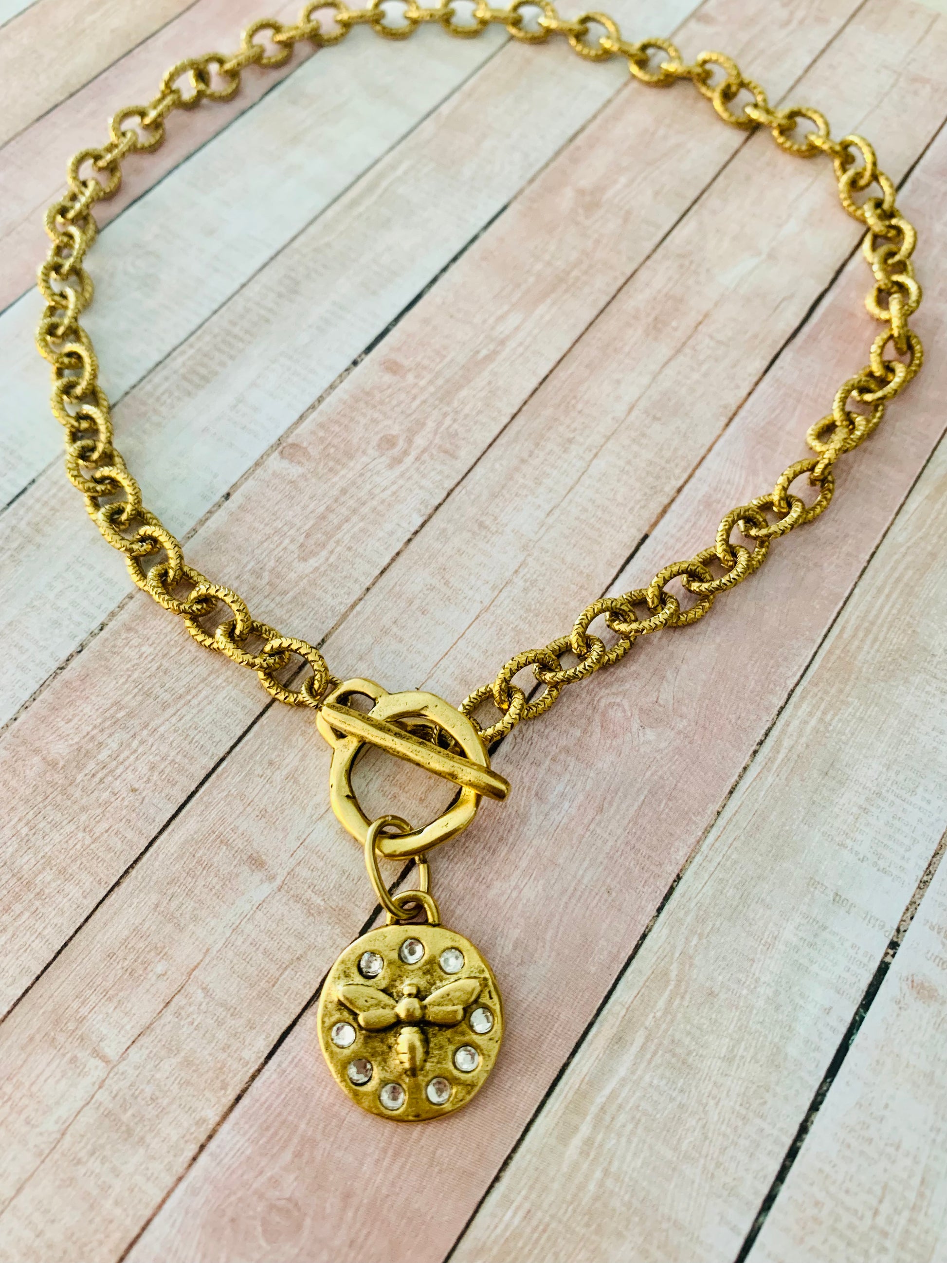 French Bee Pendent- Pewter & Swarovski crystals. Dipped in 12k Antiqued gold.