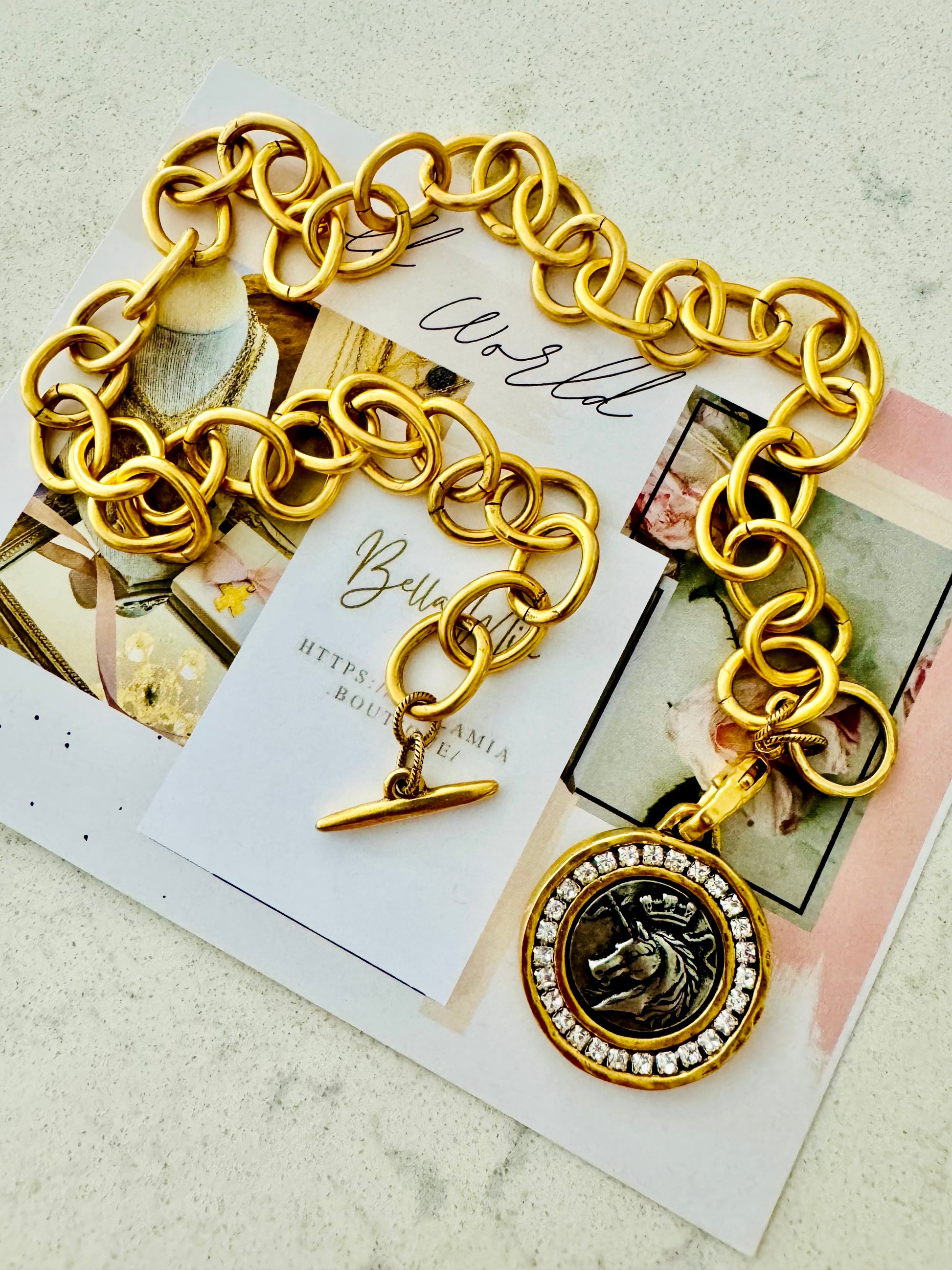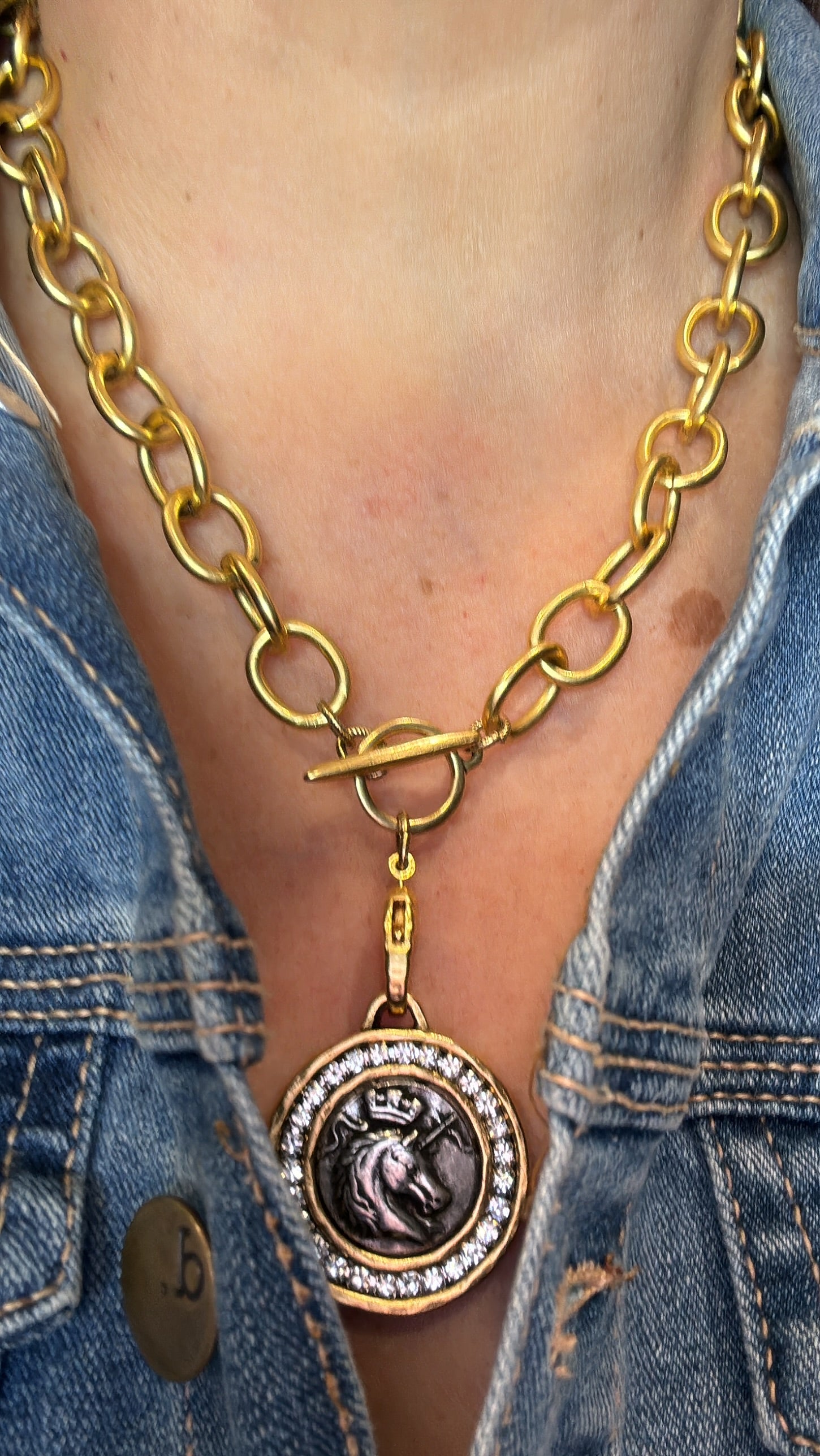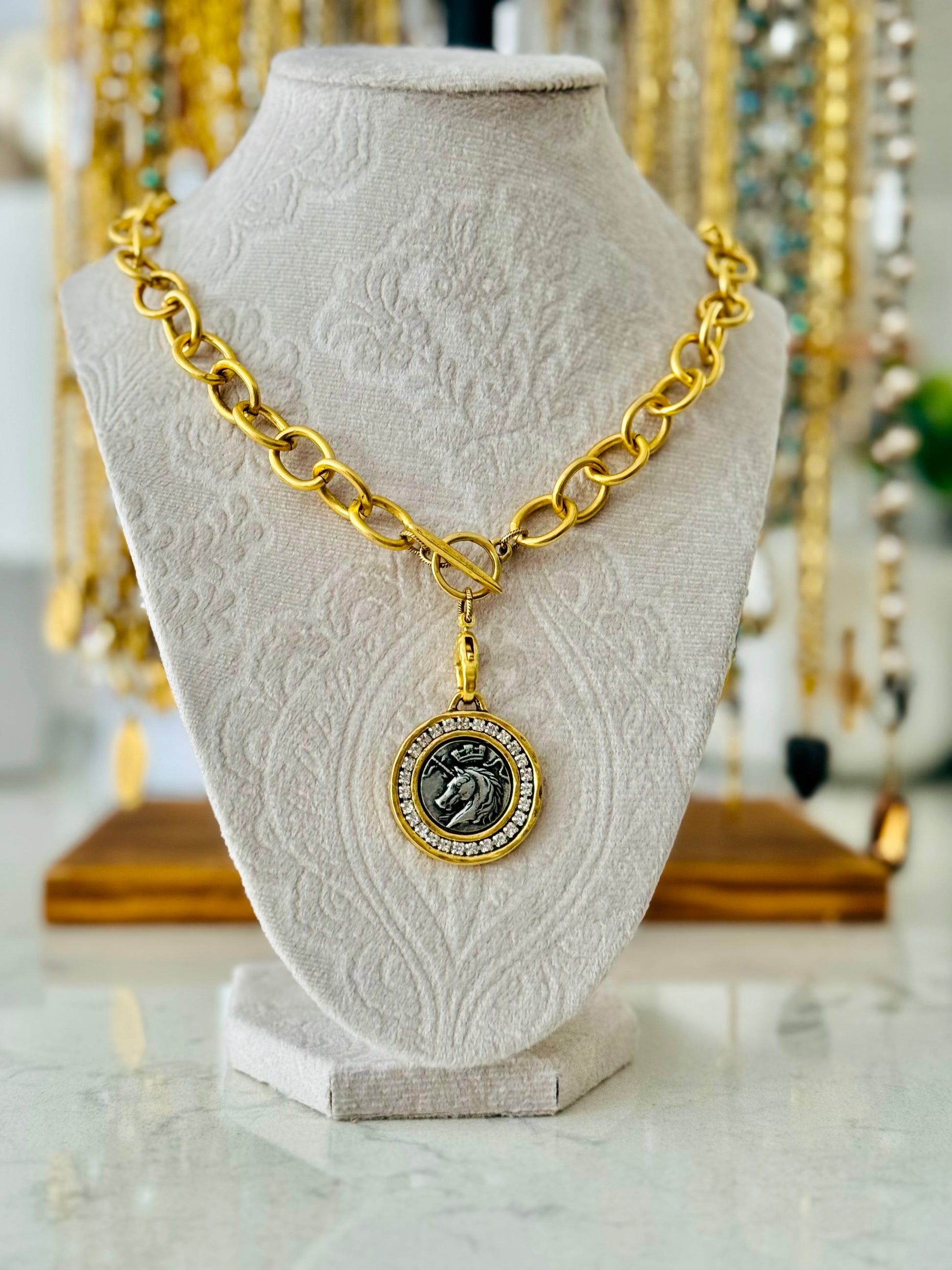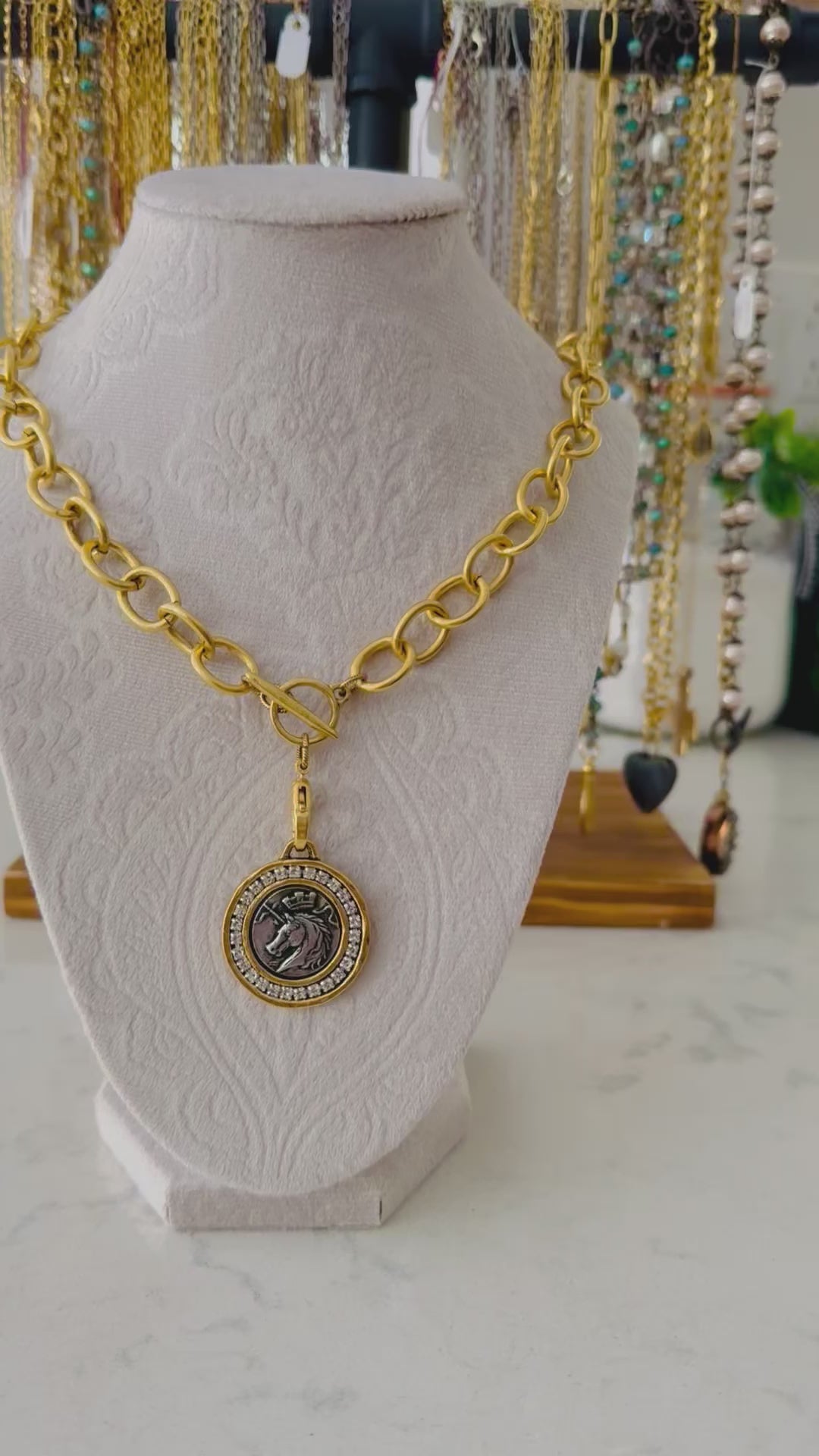 Make a bold statement with this chunky enchanting mixed metal unicorn coin pendant Necklace . Its beautiful rhinestones give it an extra sparkle and make it a one-of-a-kind statement piece. 19”
