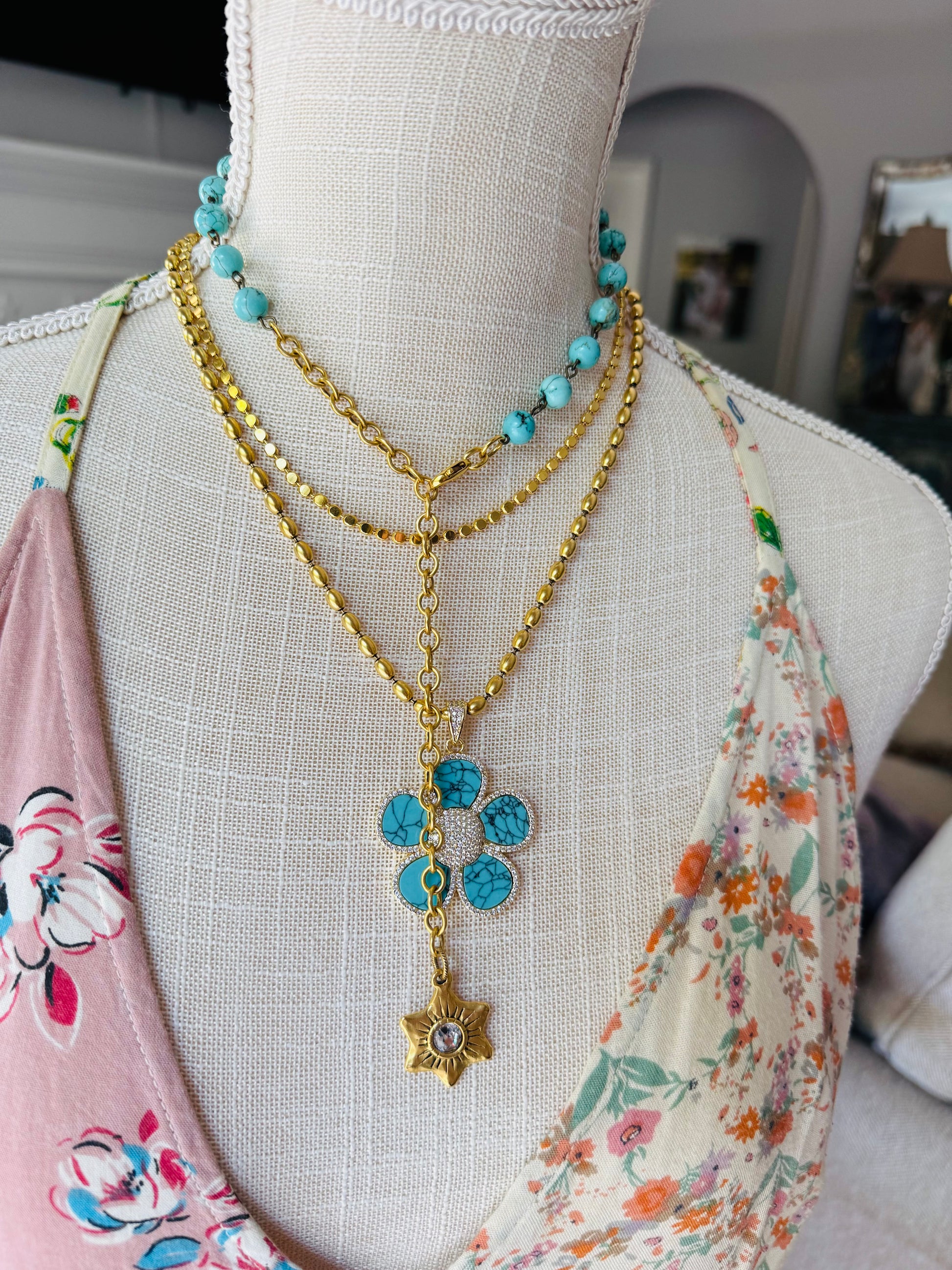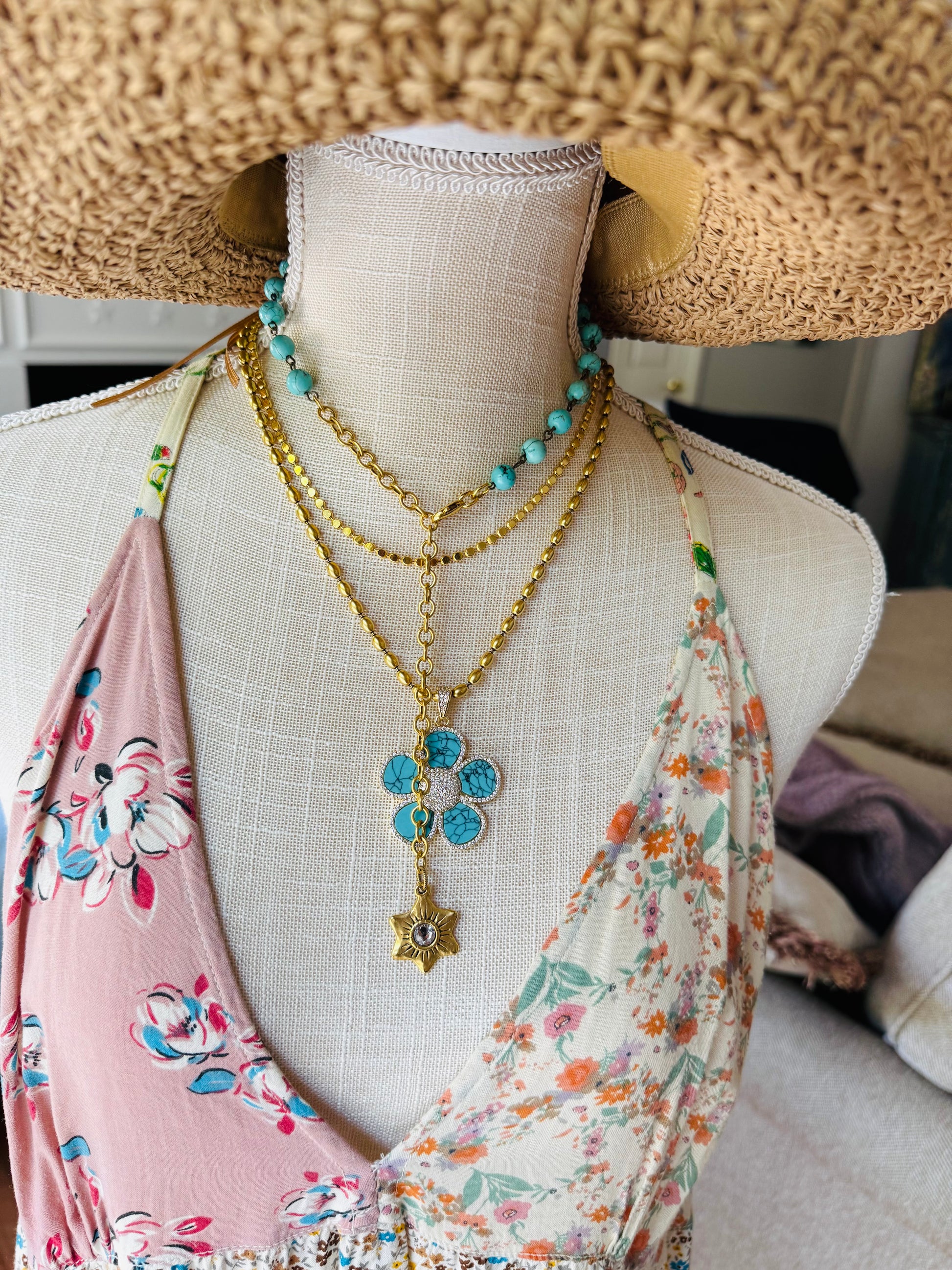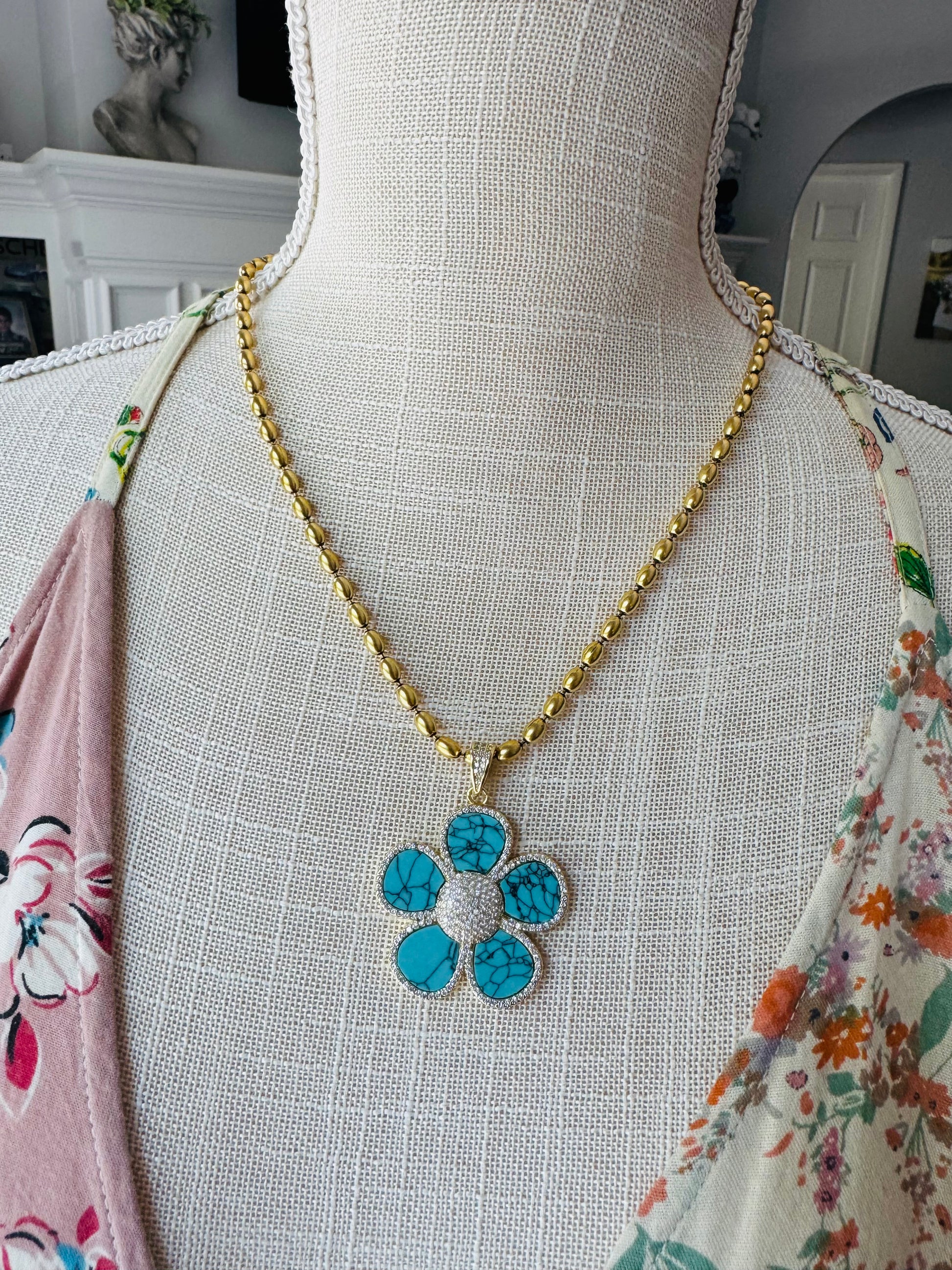 This one of a kind Turquoise CZ Flower will be your next Favorite Statement piece featuring here with a Ball Rice Bead Necklace.