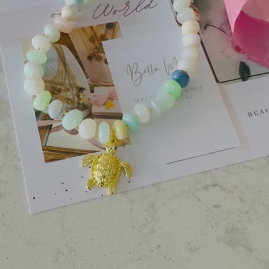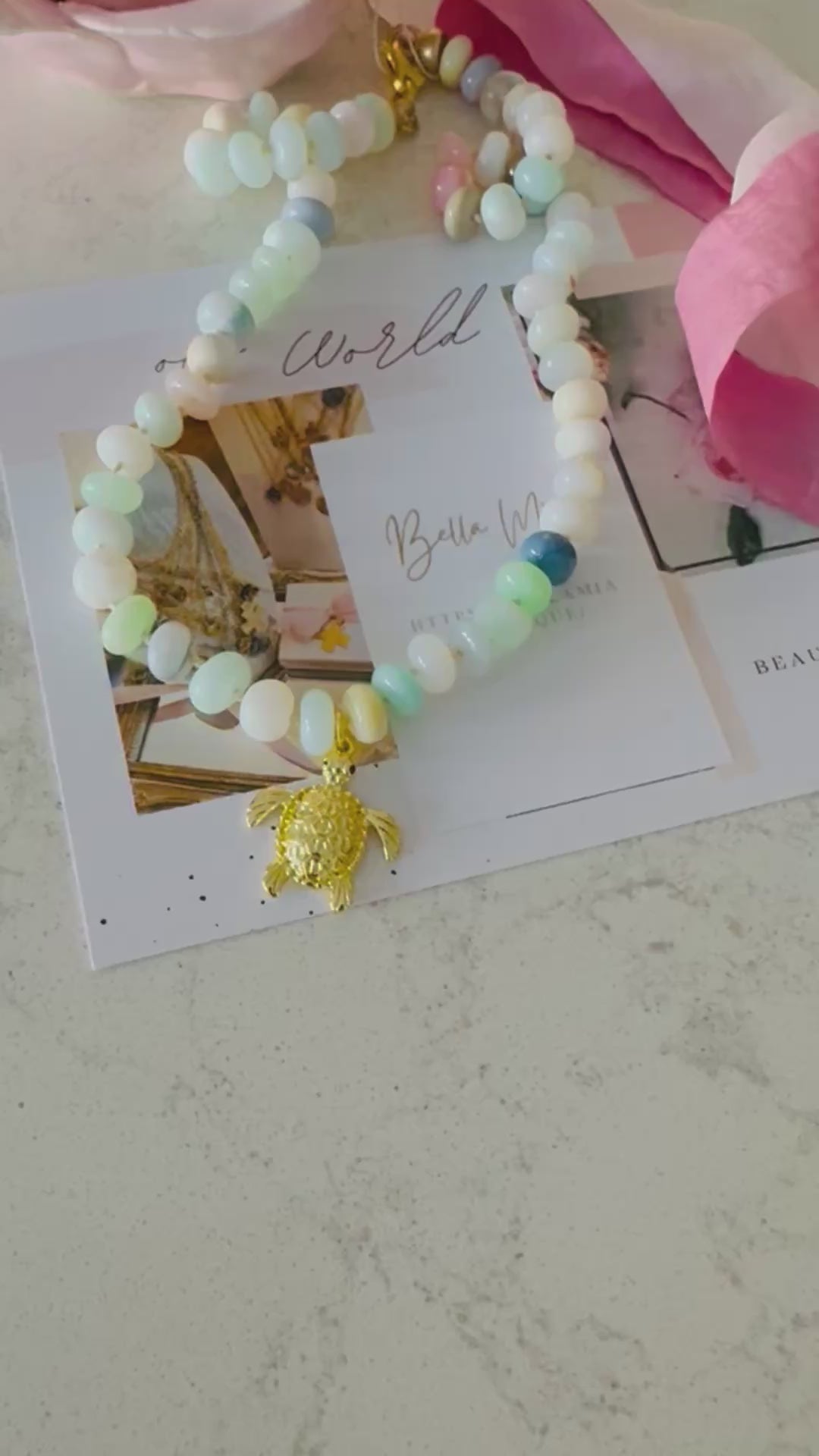 One of a kind, Colorful Mixed Pastel  Peruvian Opal Hand Knotted Beaded Necklace featured with 18k Gold Filled Turtle Pendant.
