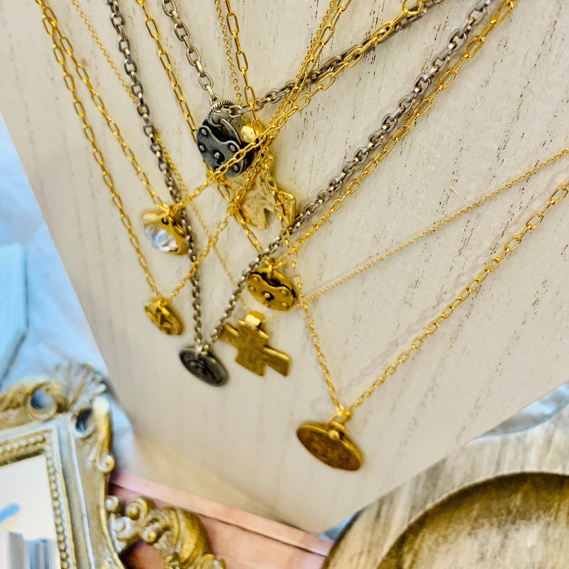 Gold-Pewter Dipped in Antique 12k Gold With A Dainty Gold Paperclip chain, offering a 2" Extender 17",18" and 19" made of Brass and Finished in 12K Gold.