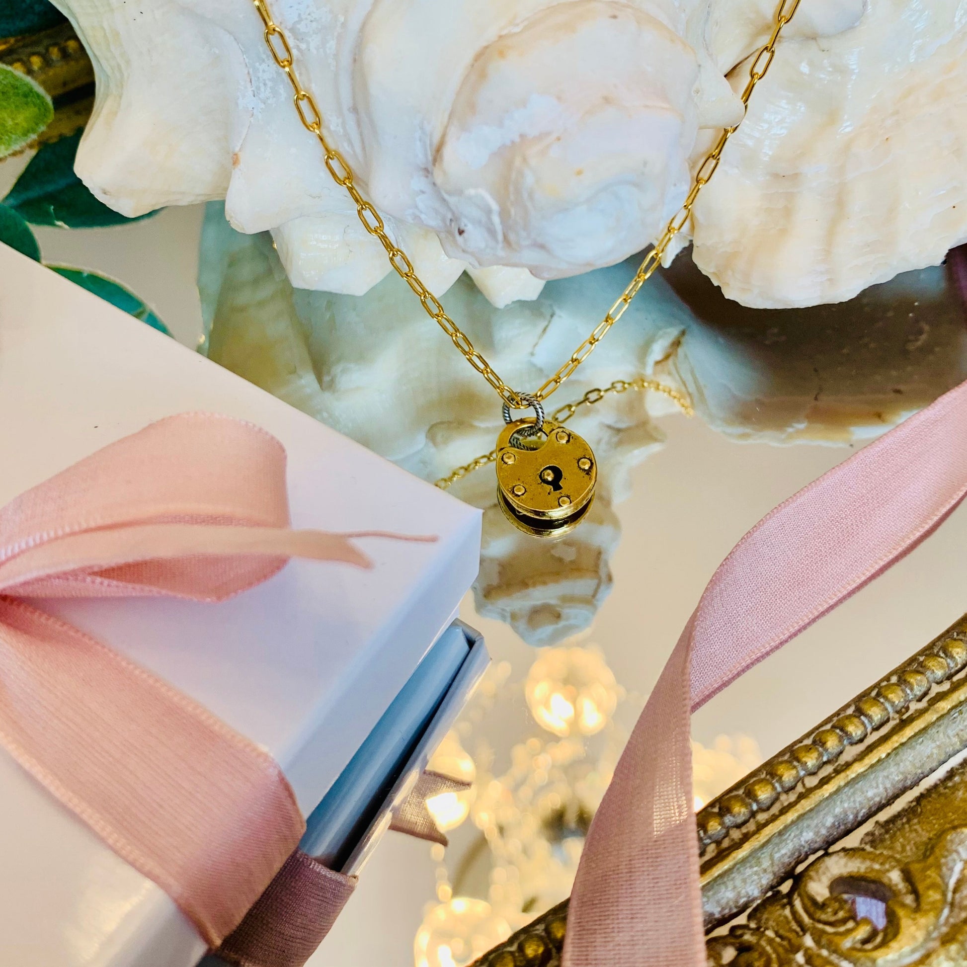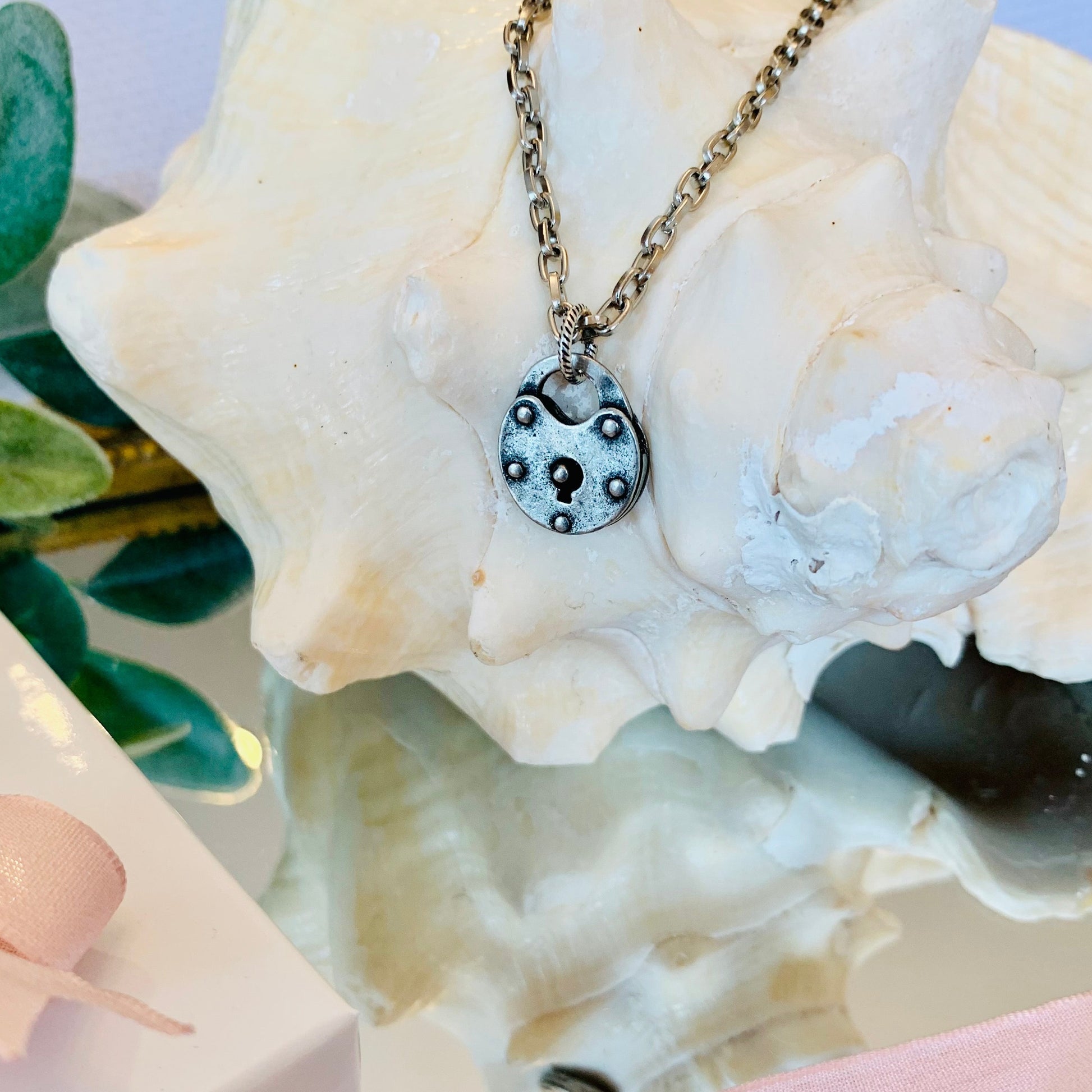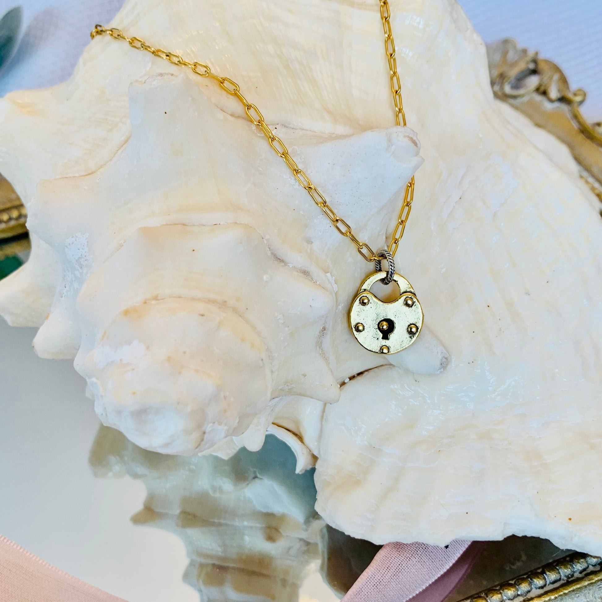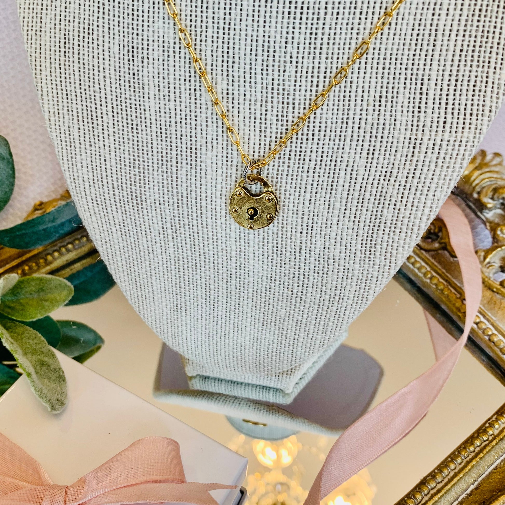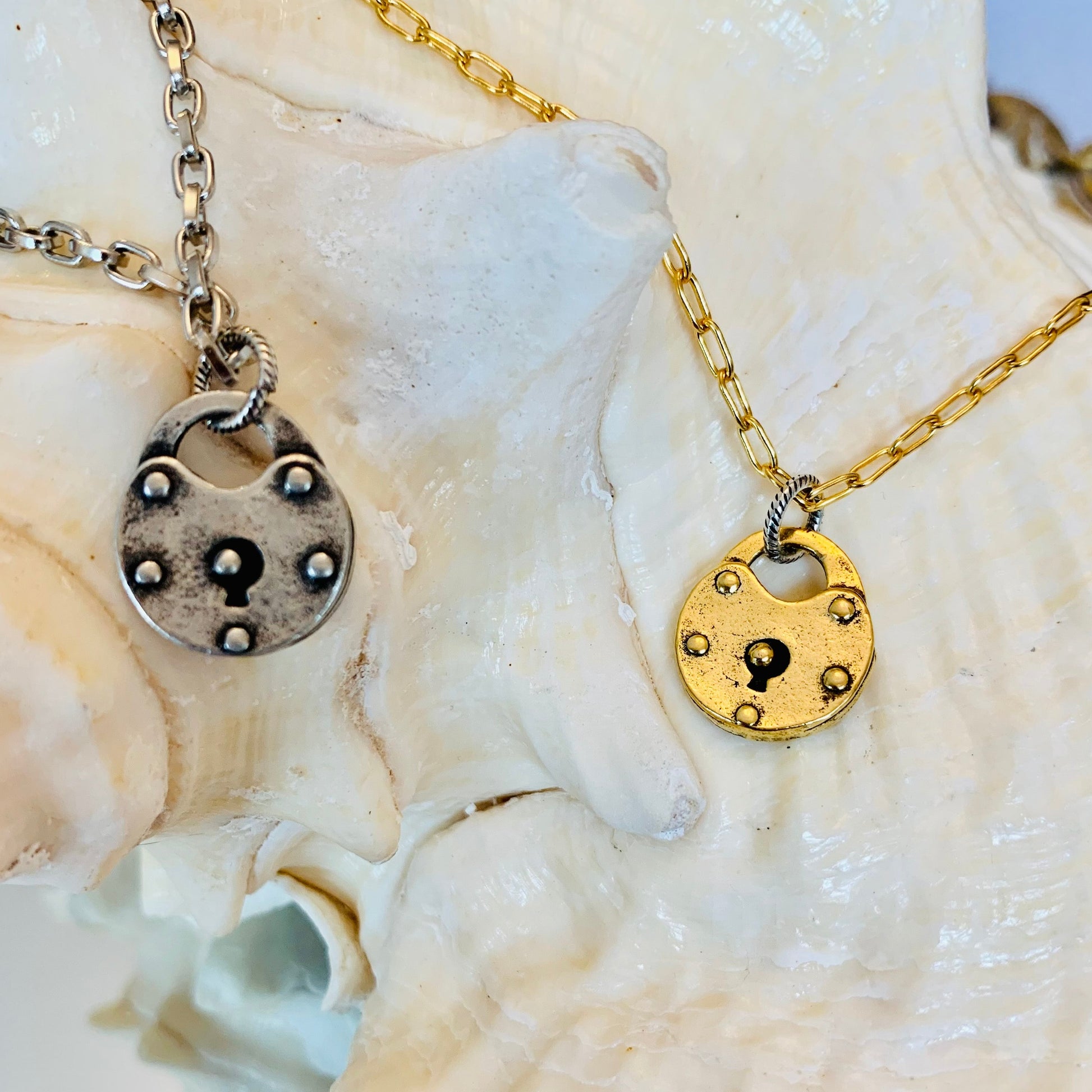 Did Someone say Statement necklace?...This Delicate Old World Lock Necklace is an Ancient Symbol That Signifies Security&Protection ..It's also one of the Hottest Trends right Now and She can be worn many Different Ways, Effortlessly! Pewter Comes in Gold & Silver.