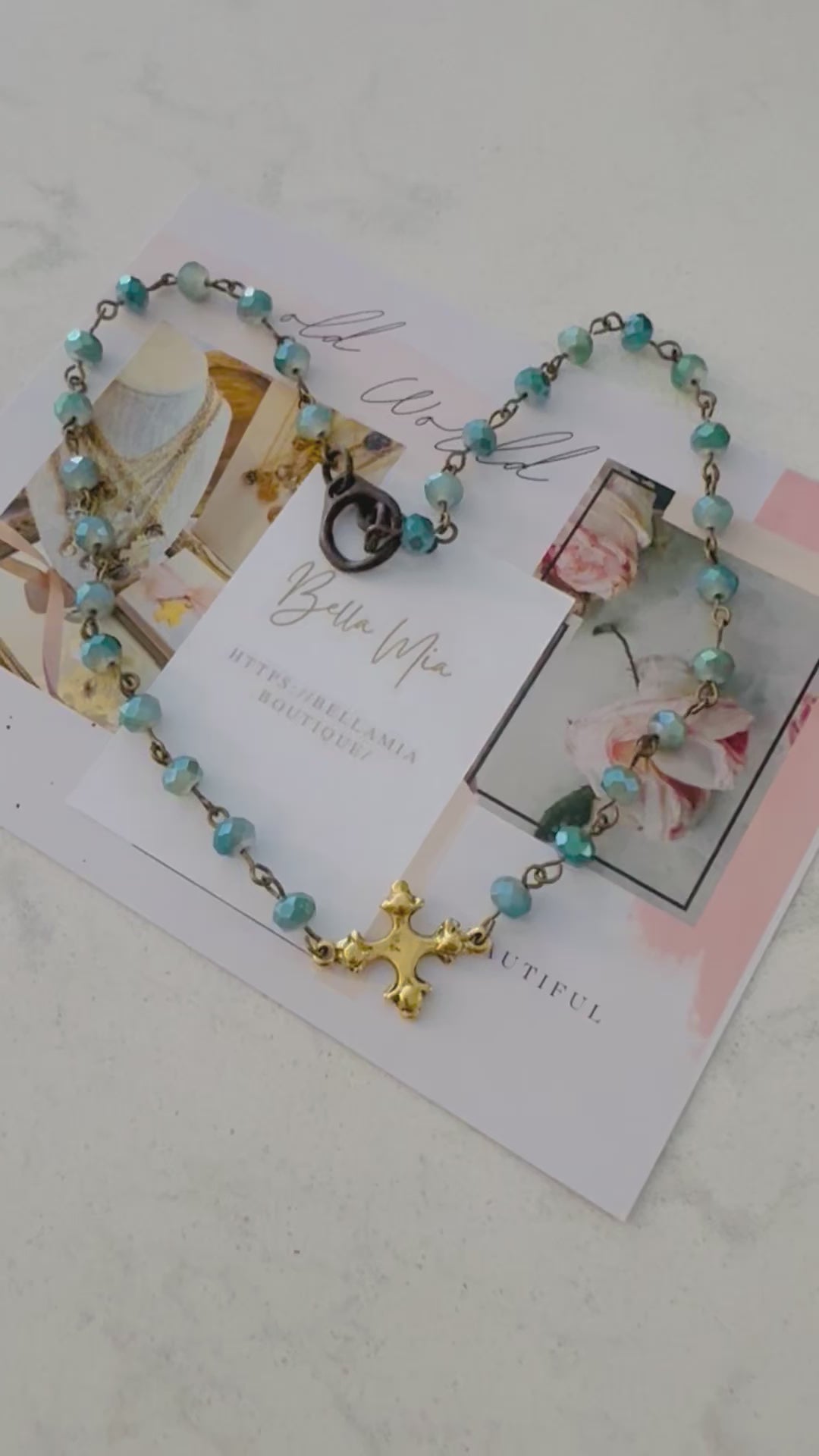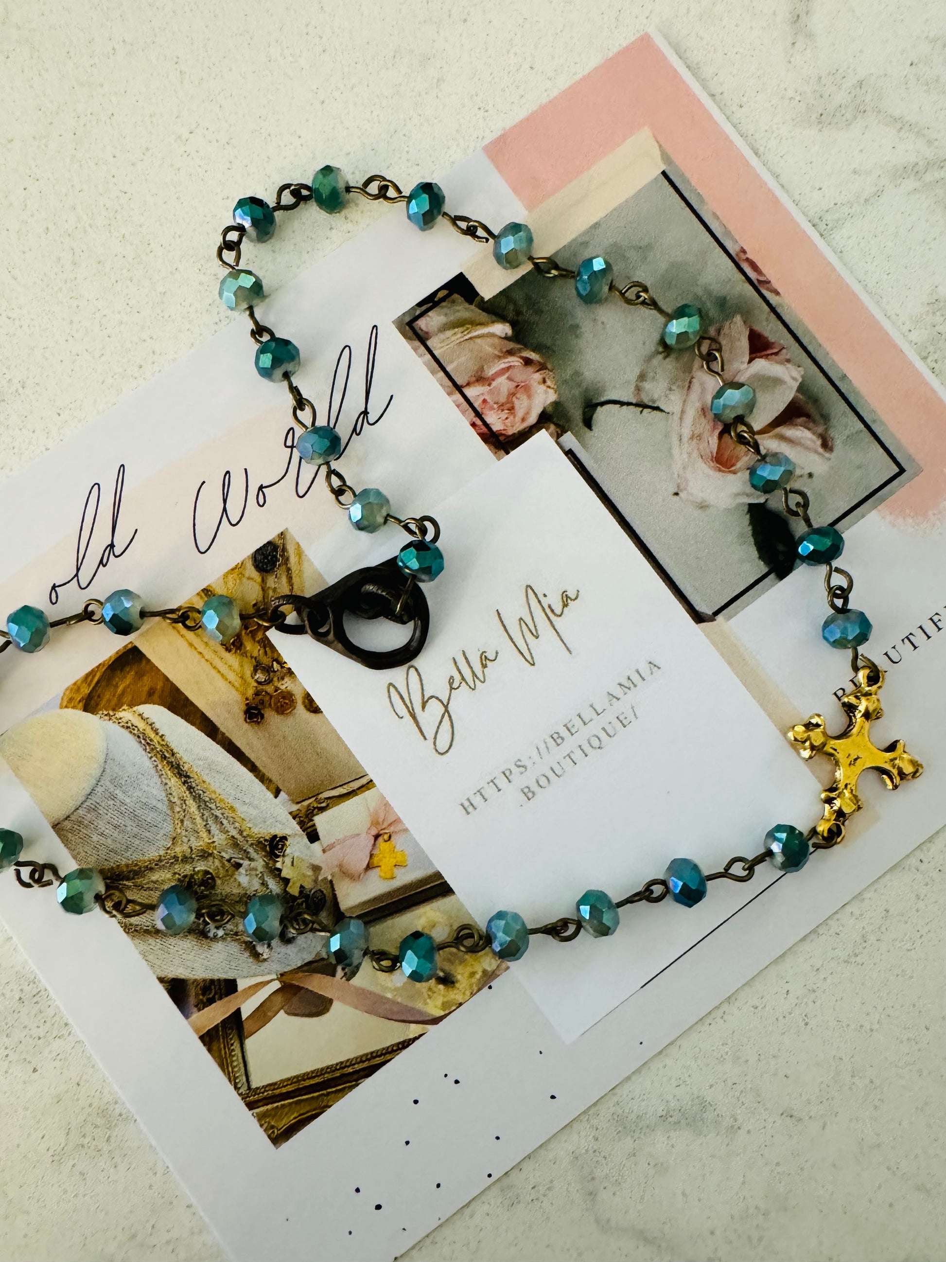 This one of a kind ‘Dotted Choker’ & her sparkly iridescent Rosary chain is rebellious & confidence in her BOHO Vibe.