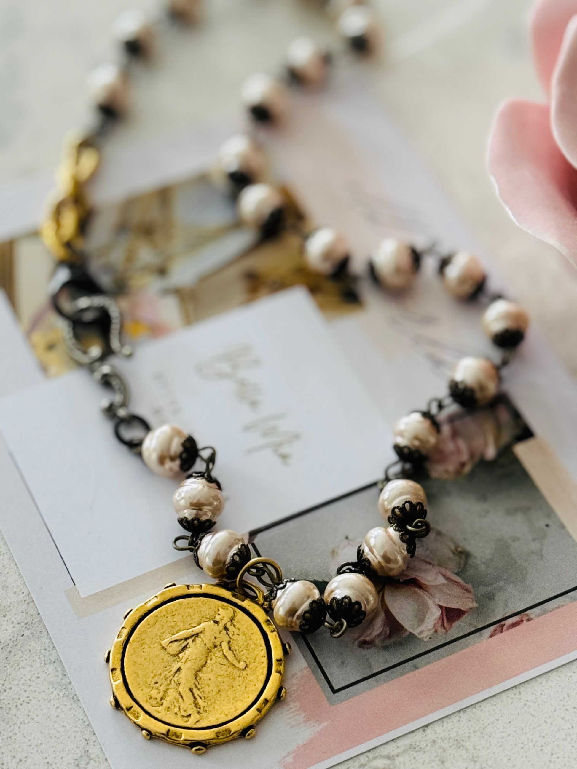 This is a  One of a kind ‘French Sower’ Porcelain Glass Pearl Necklace … with her Mixed Metal giving her nothing but Patina&Soul.