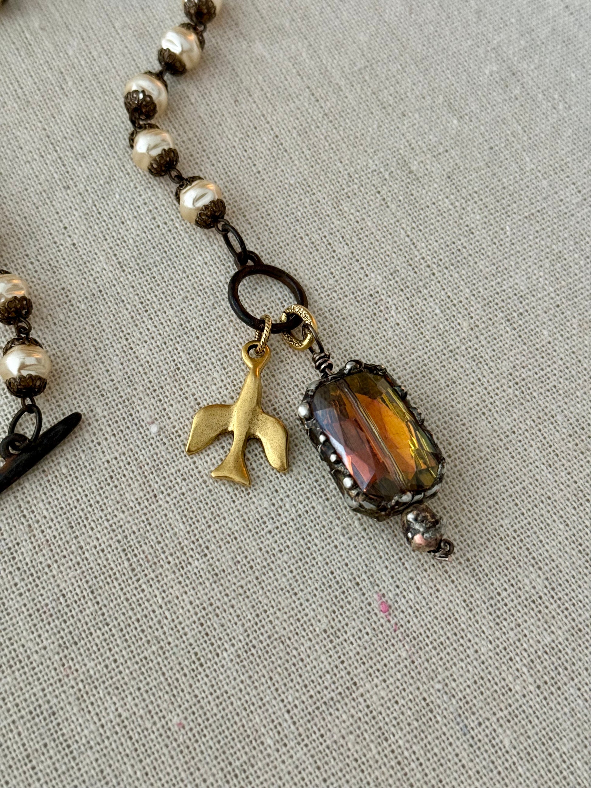 She is featured here with a 18-19” Single strand of Czech glass pearl rosary style necklace, a 12k antique gold Dove charm and a-smooth pewter brown toggle clasp completing this one of-a-kind masterpiece.