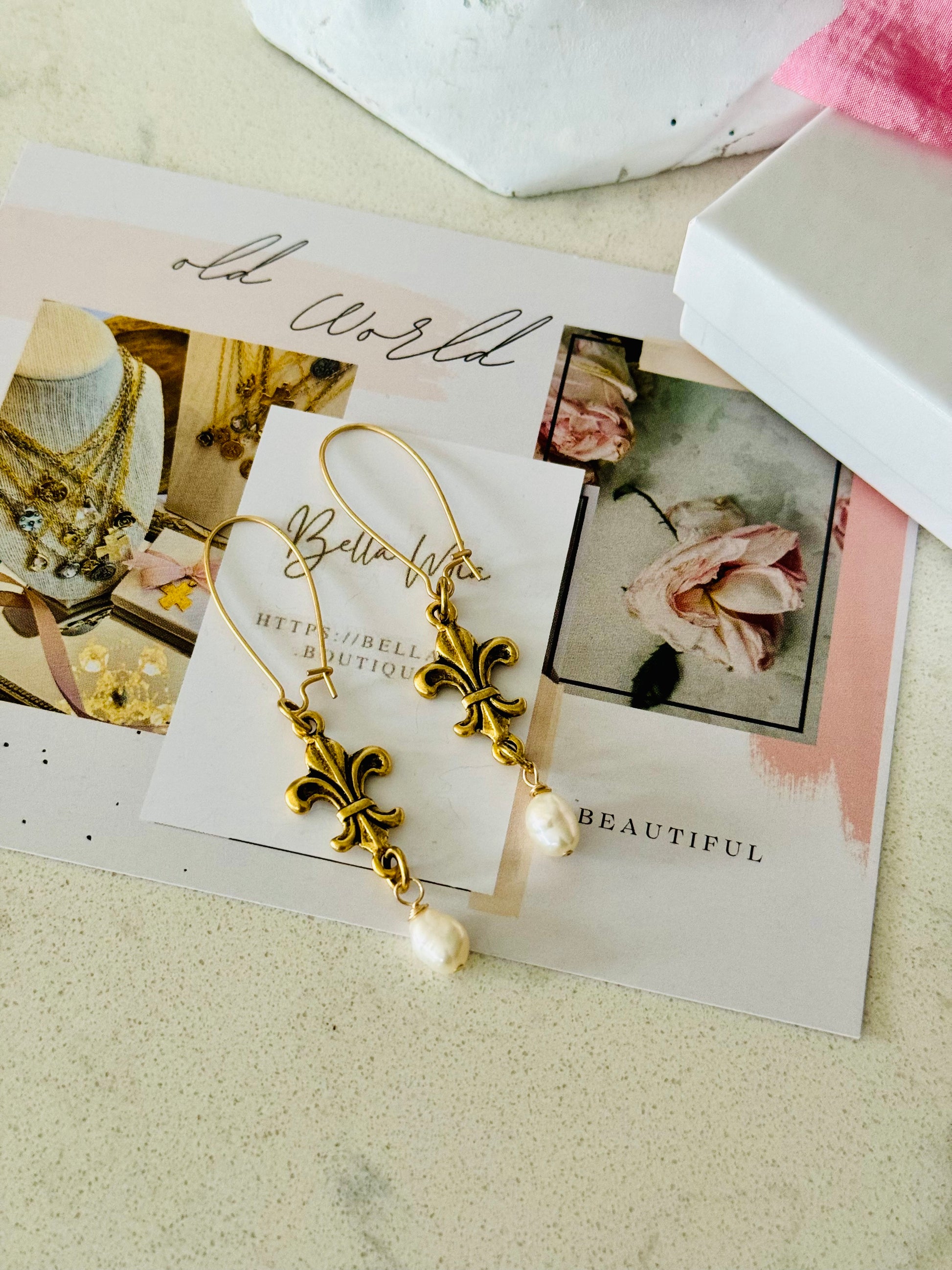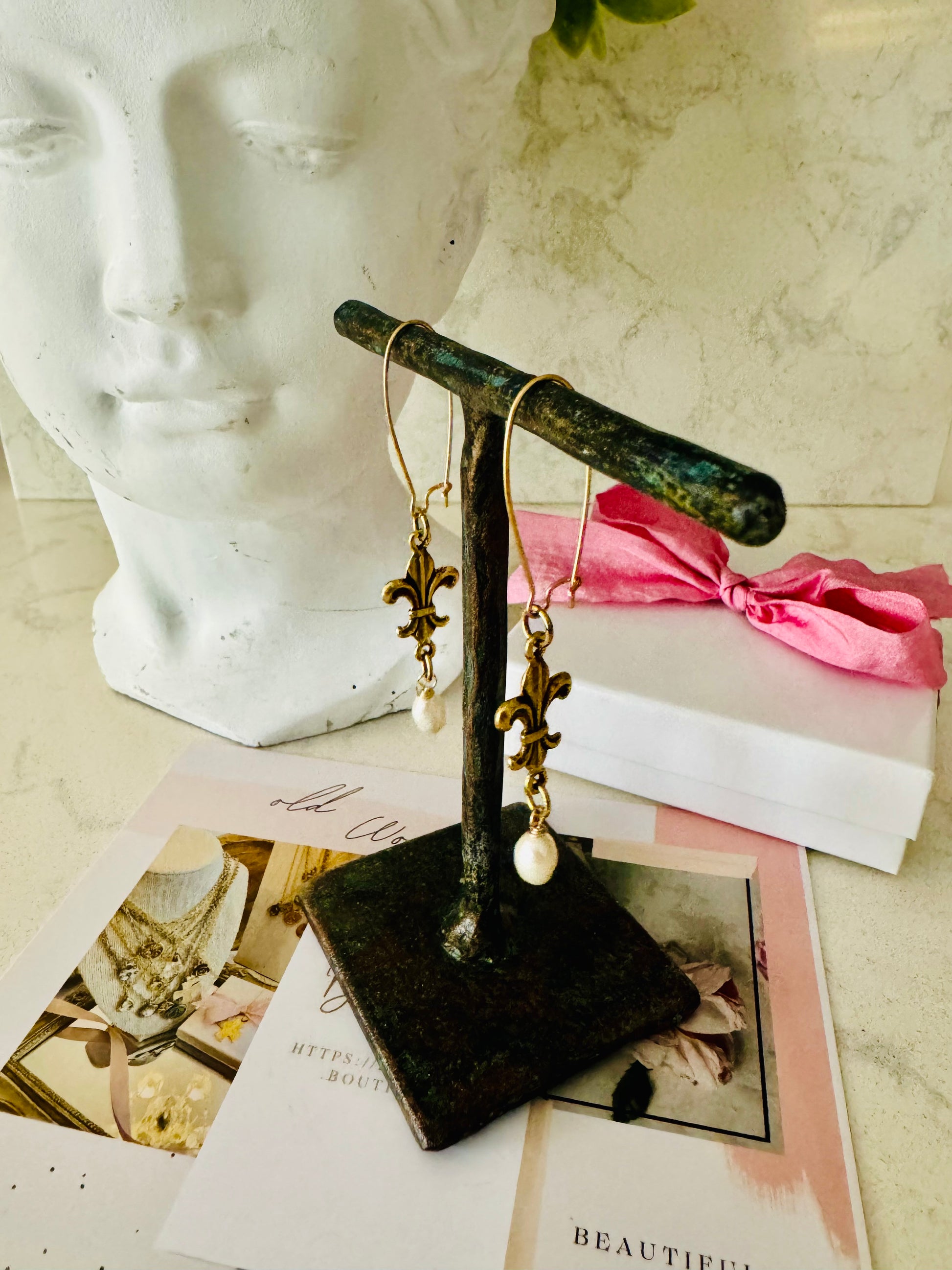 These unique 'Fleur de lis' pair of antiqued gold earrings with her Fresh Water Pearl Teasers are French Quarters Fashion Style Elegance inspired by the intricate scrollwork of the Art Nouveau movement that embodied elegant curves & long lines.