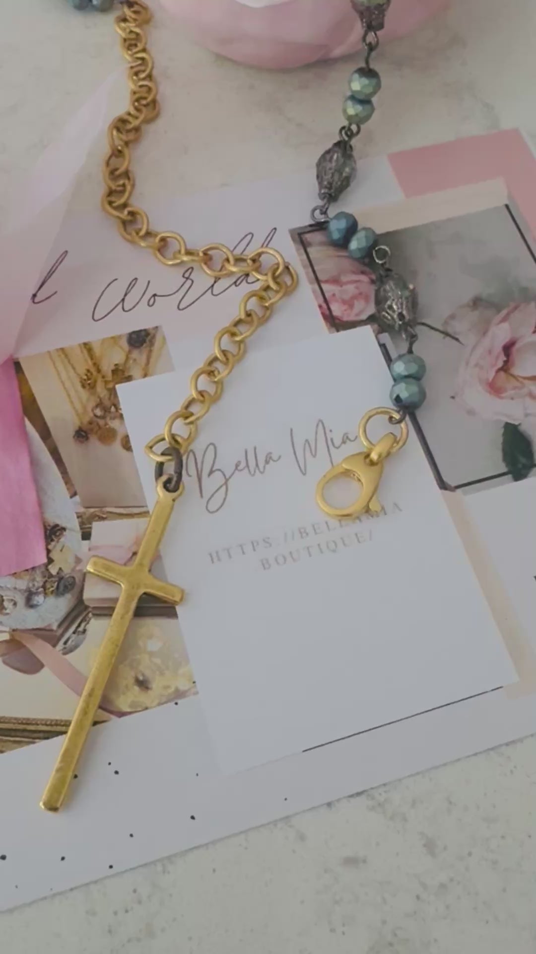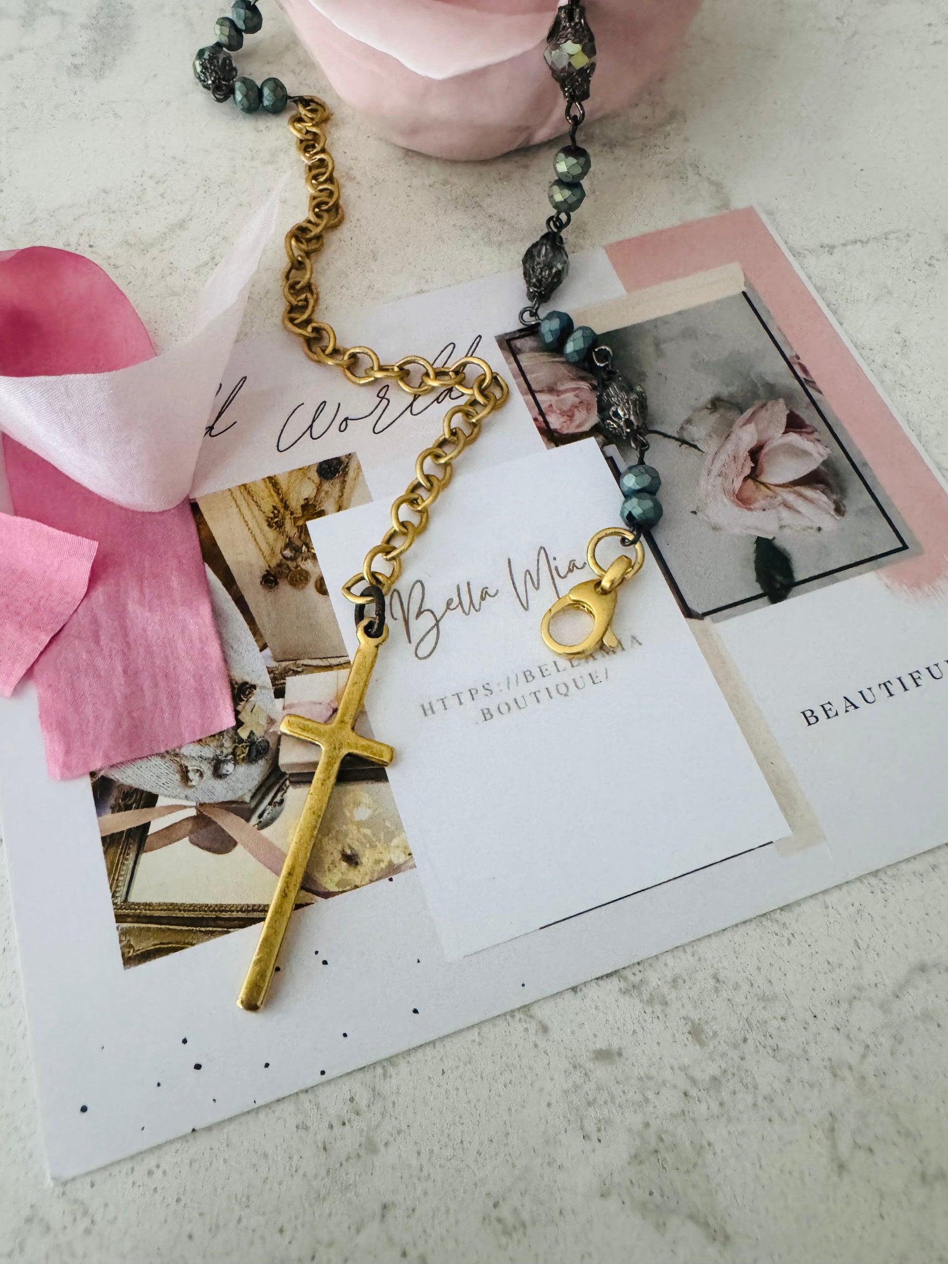 This Gorgeous Rosary mix with her Gold chain & Skinny Cross pendant is a must have! …..adding the perfect Statement piece. Boho Drama Obsession.