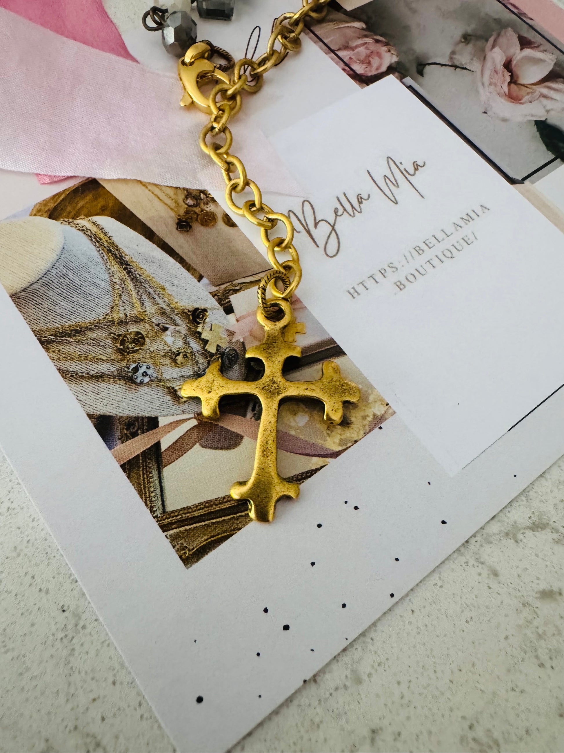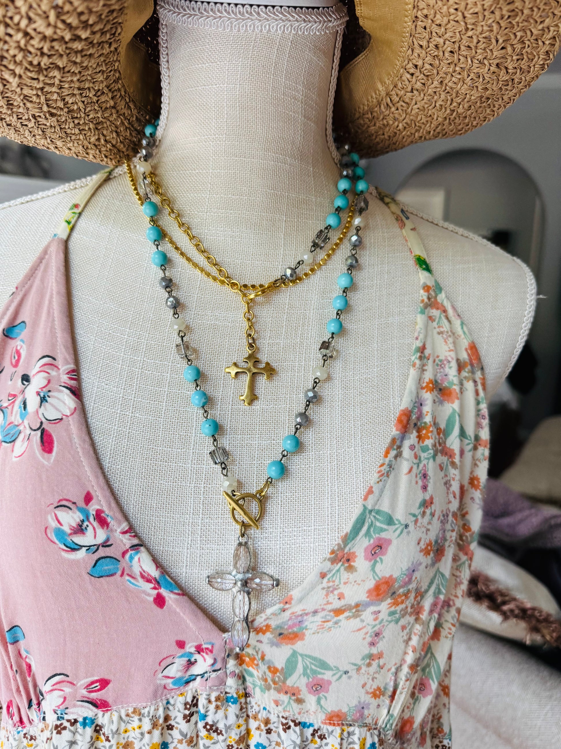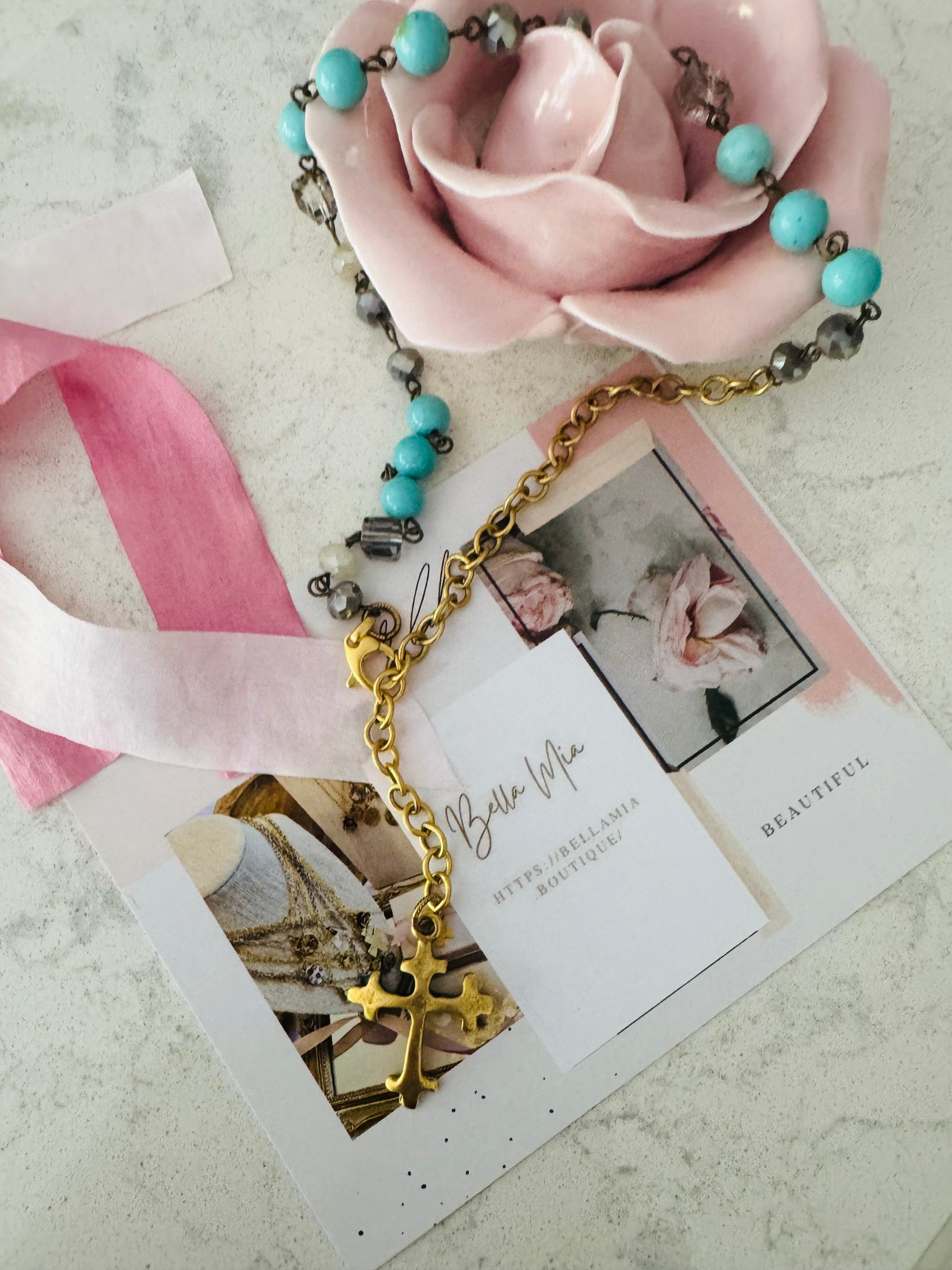 This Gorgeous Lariat m -Turquoise Mixed in with gold metal & Spanish Cross , is one of a kind! She's stunning adding the perfect Statement piece. Wear her all alone or create your Next Stack with some Boho Drama. This one was named after my Beautiful Sister in Law .