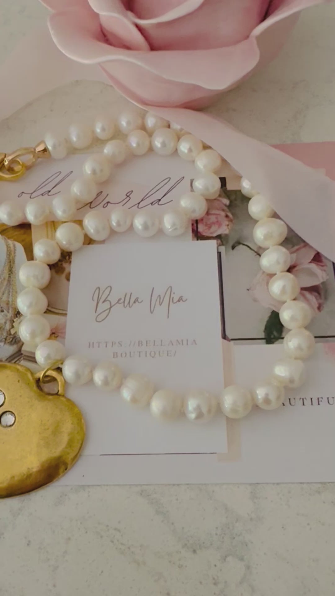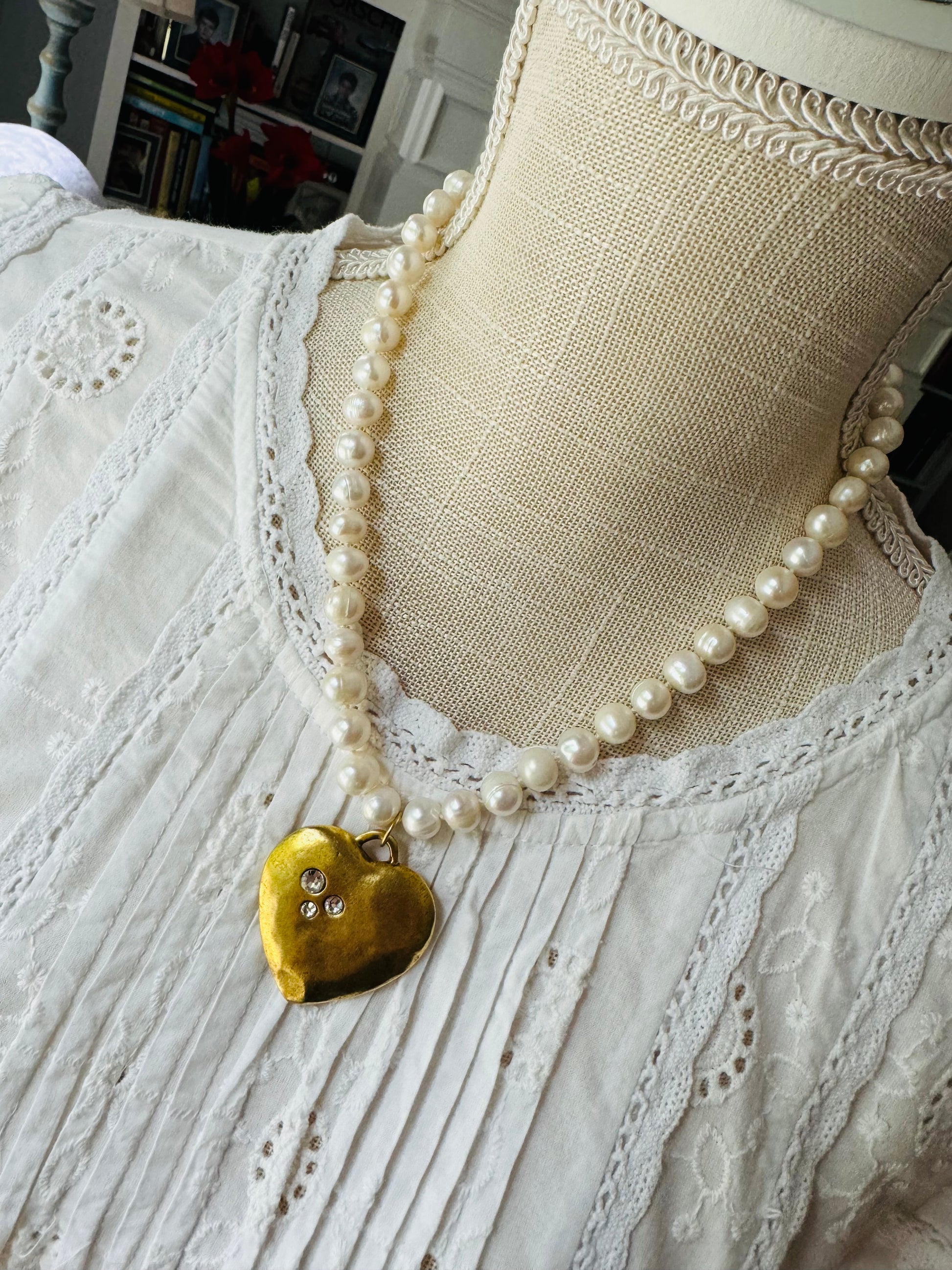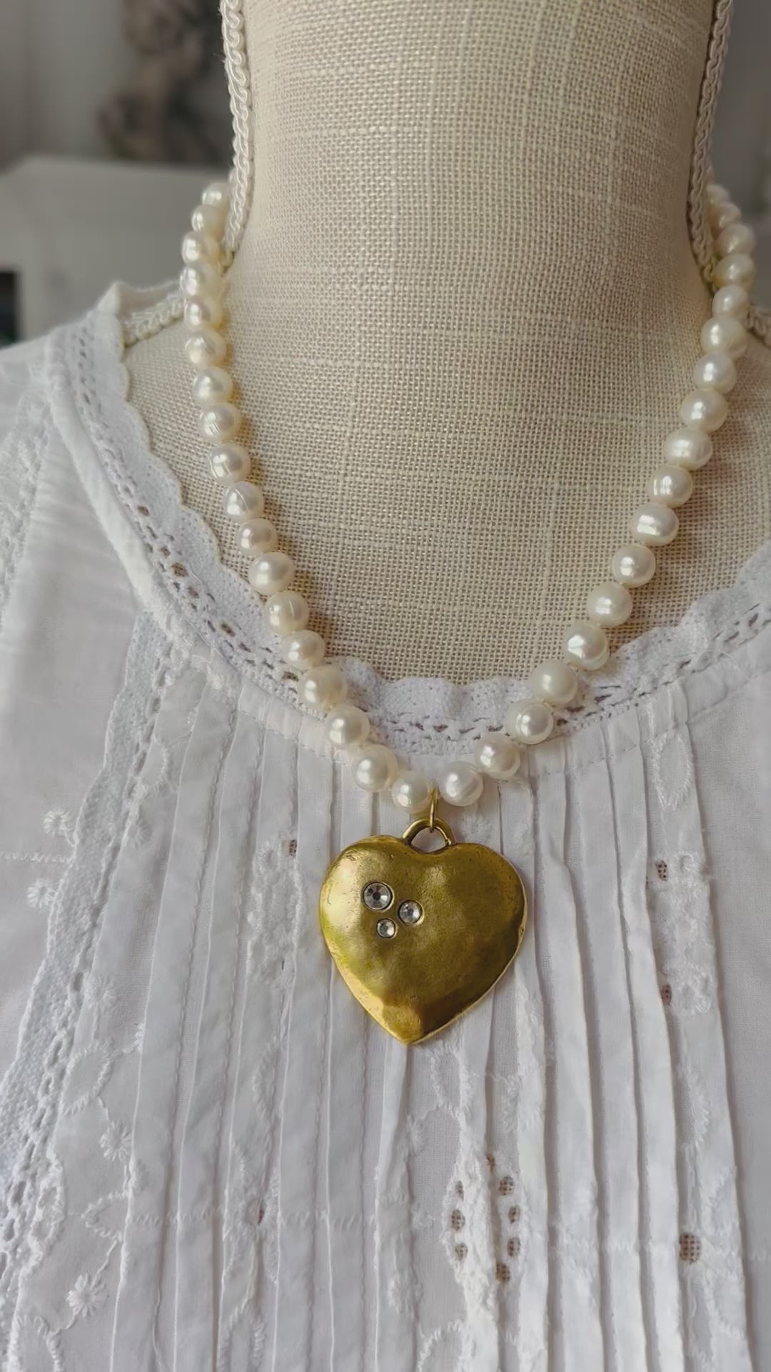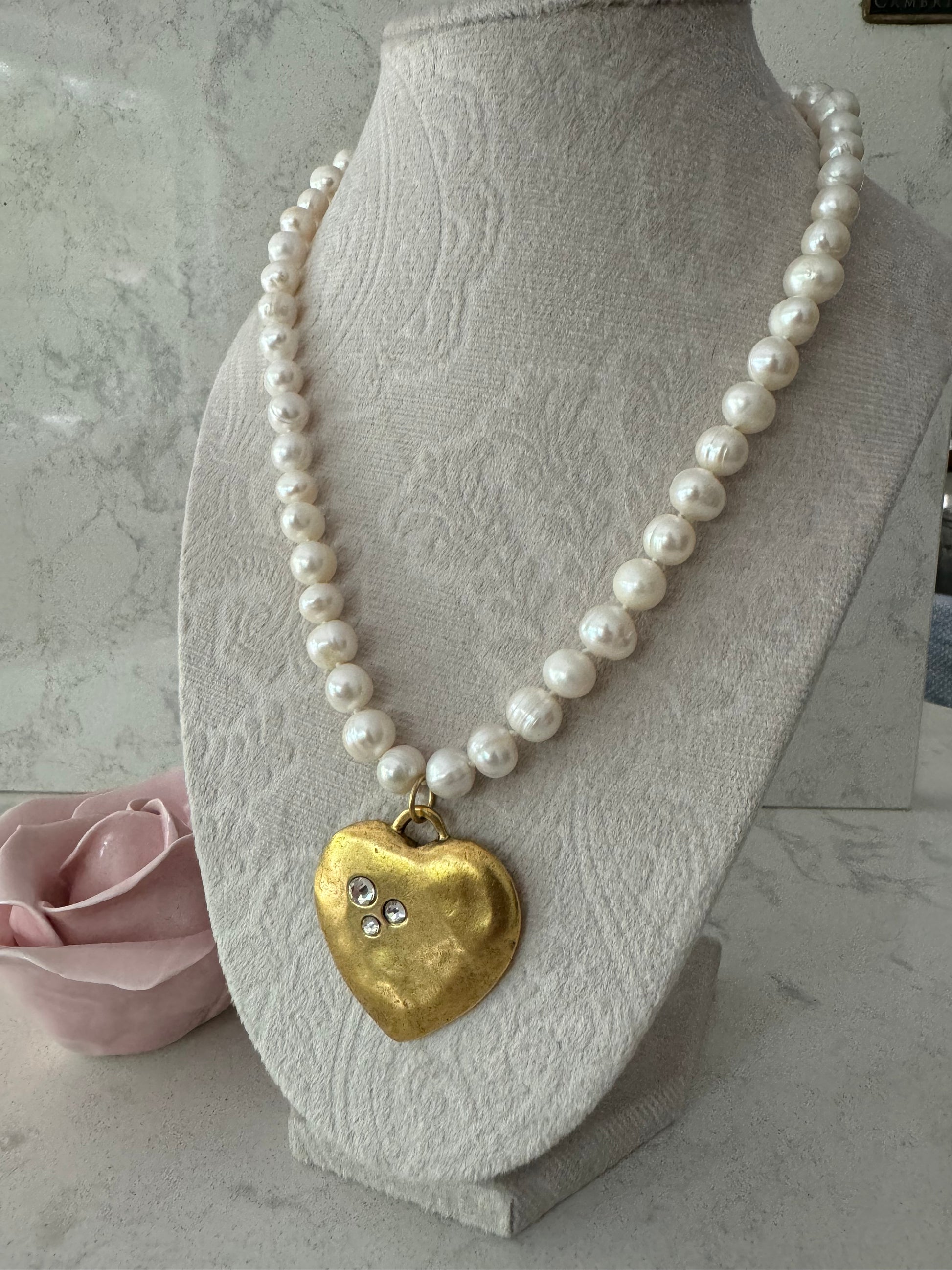 Fresh Water Pearls Beaded Necklace with large Gold Rhinestone Heart Puffy Pendant Necklace .
