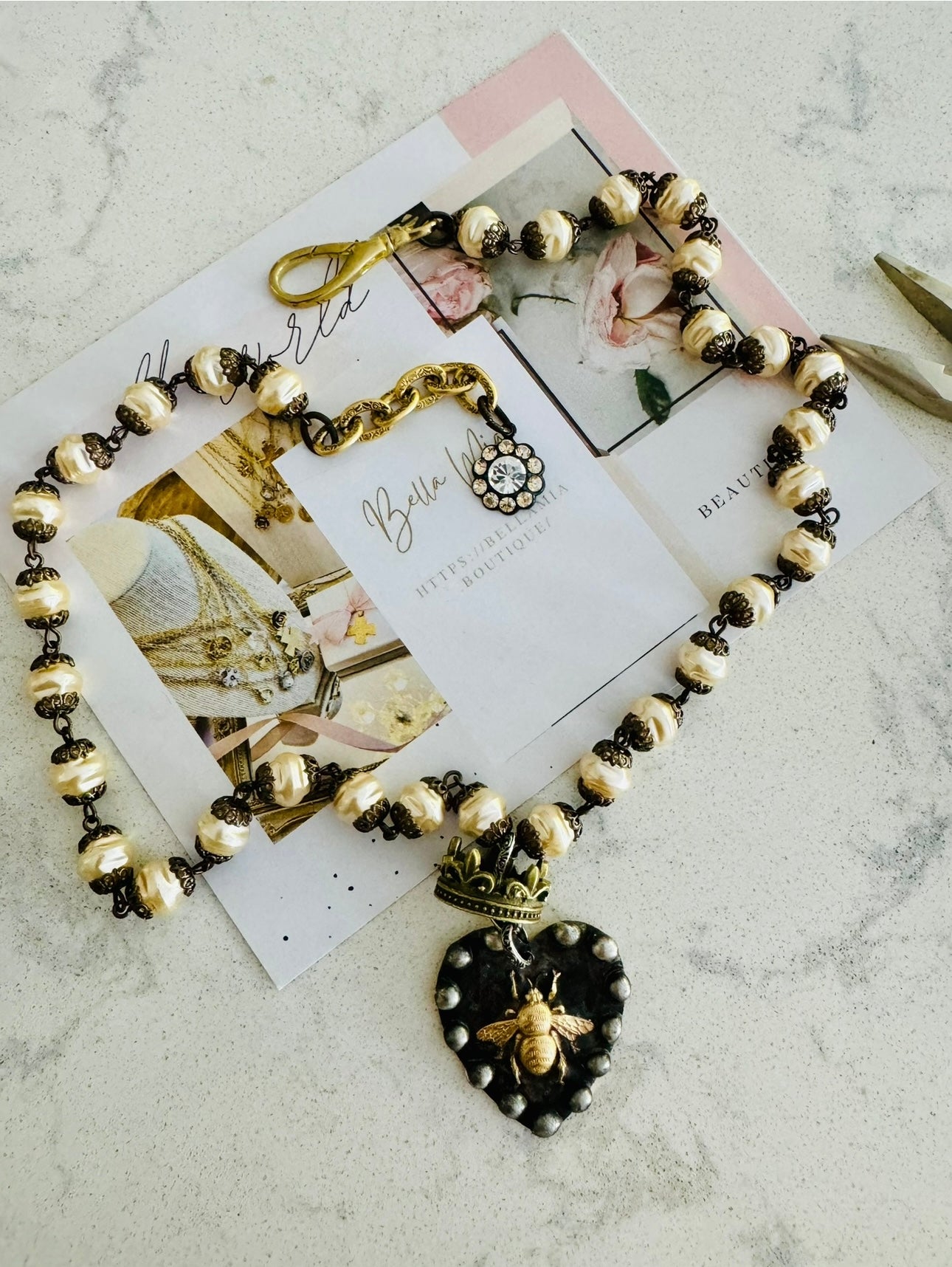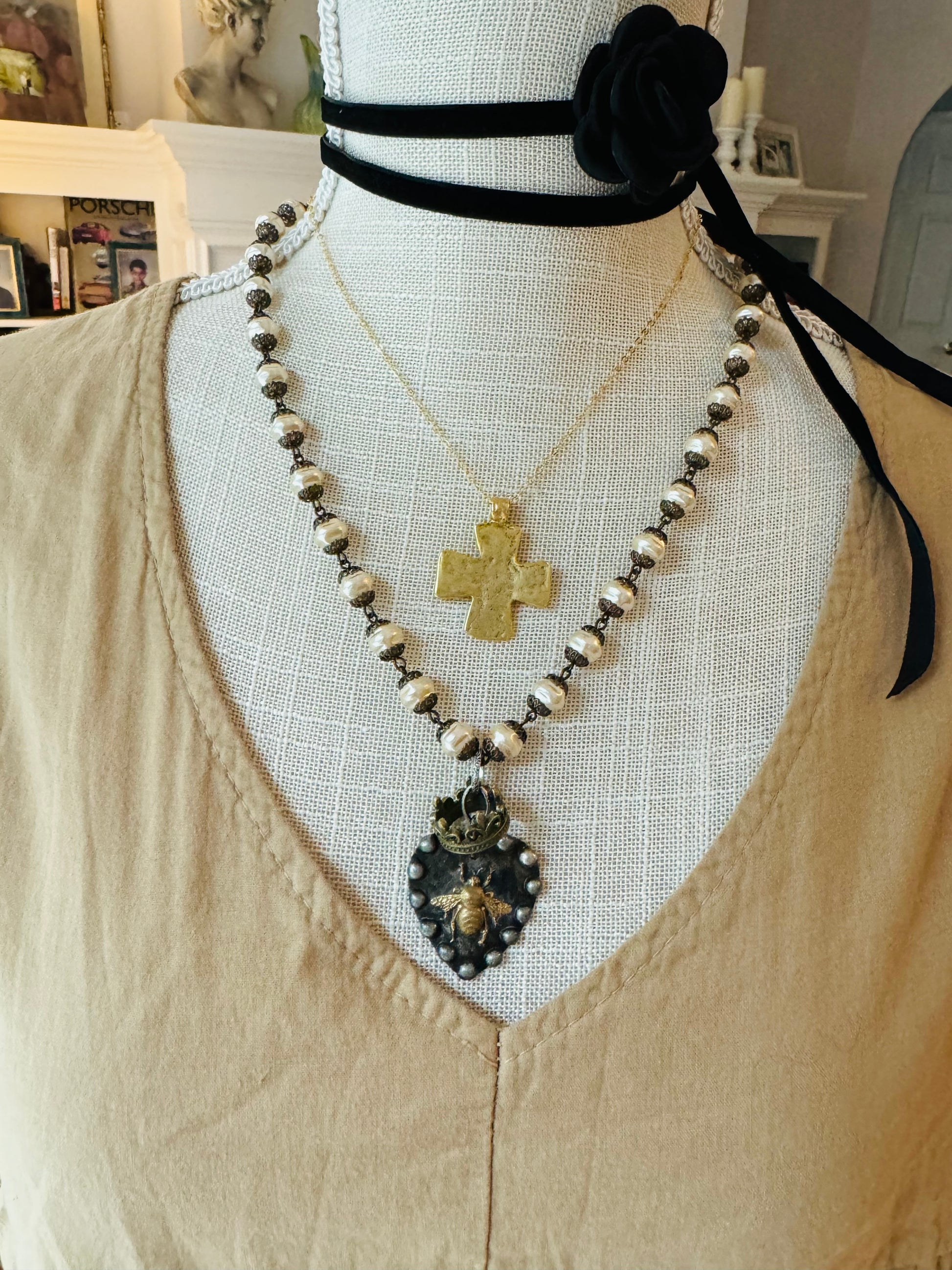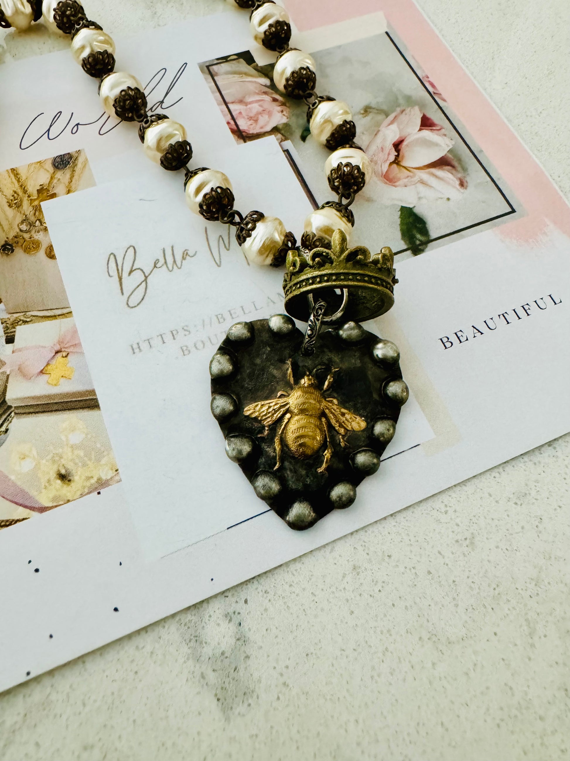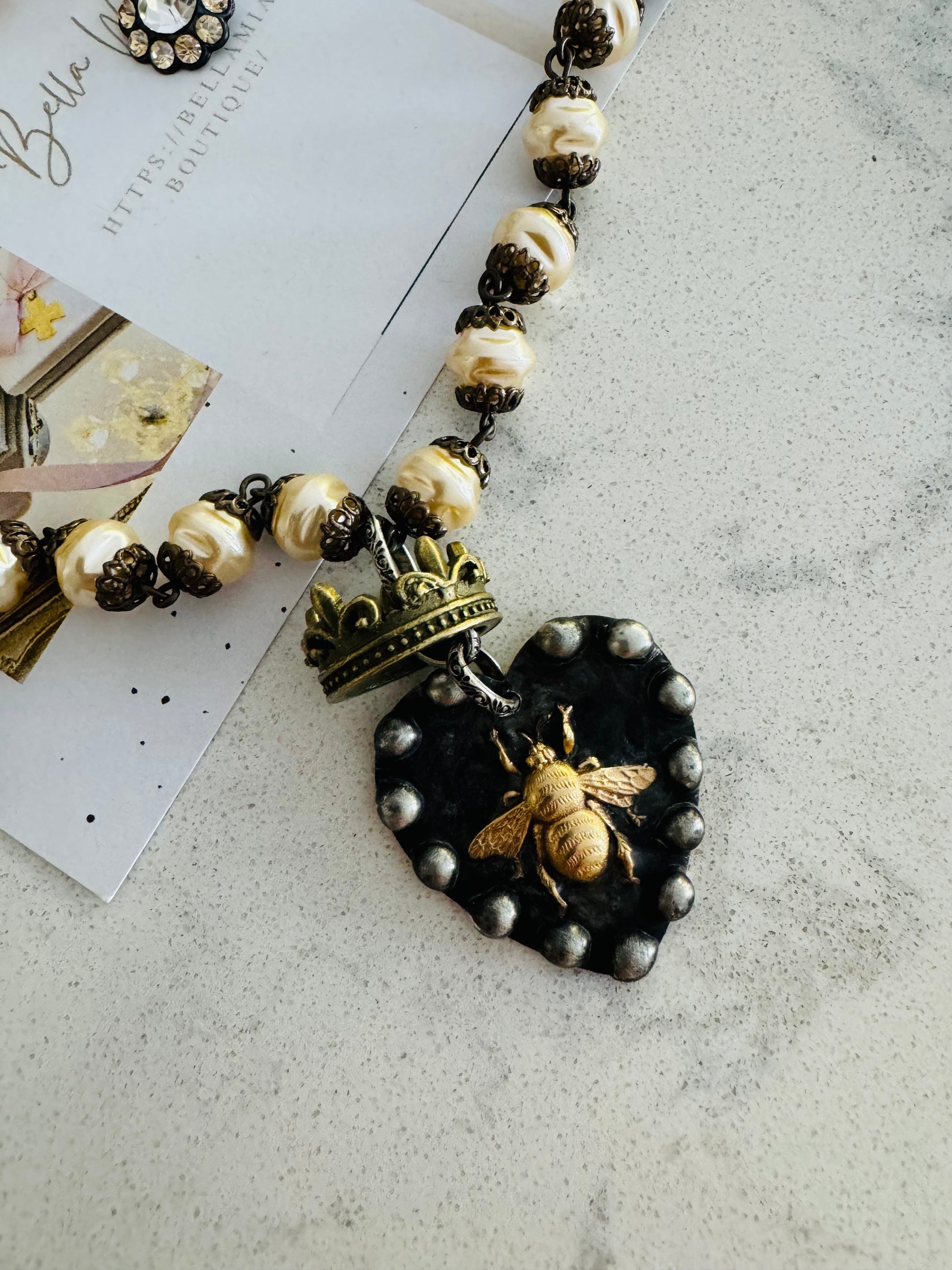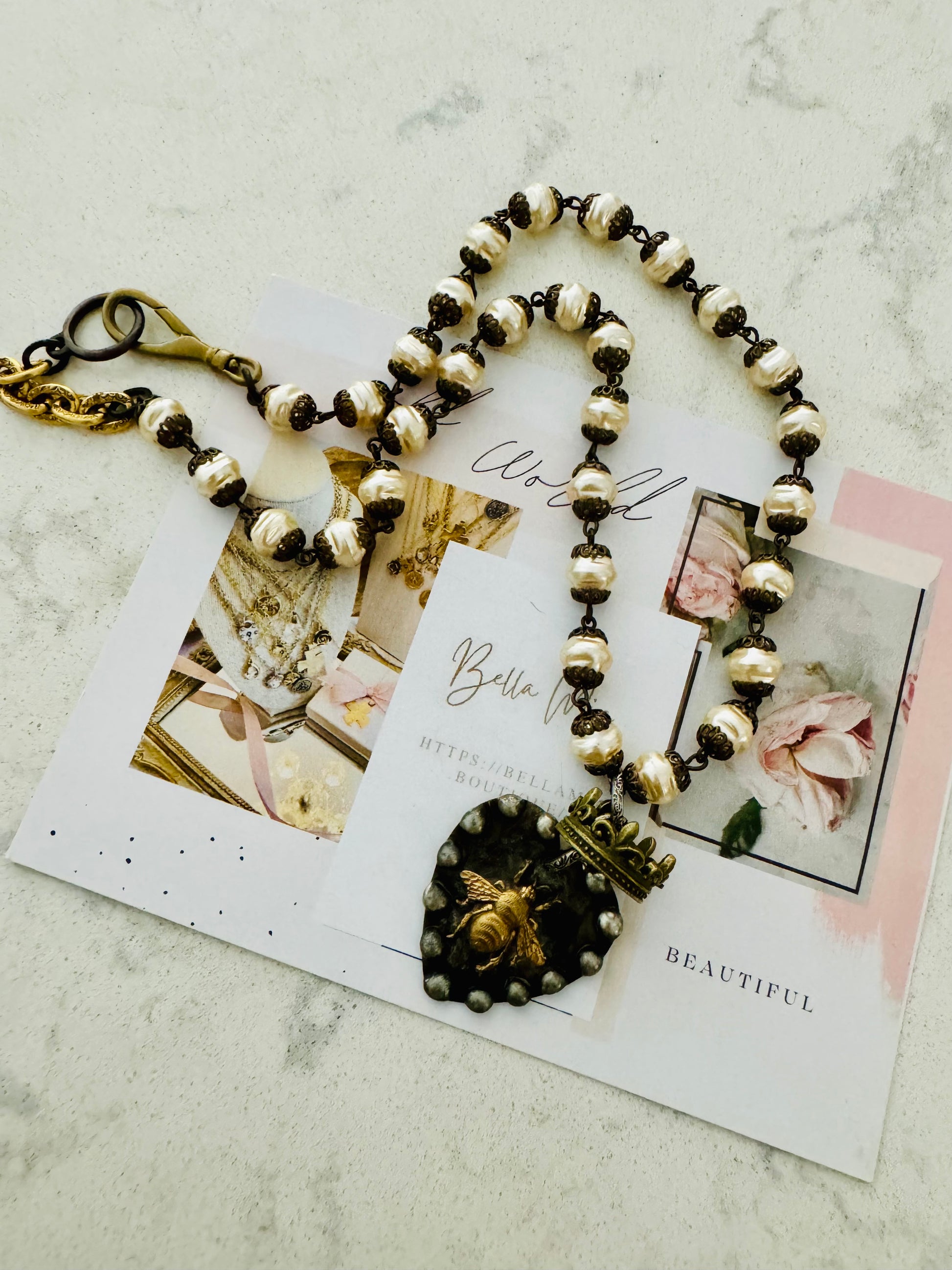 One of a kind -Handmade ‘Queen Bee’ soldered pendant with floating crown Paired with a 21” Handmade rosary, vintage glass pearls chain with toggle..