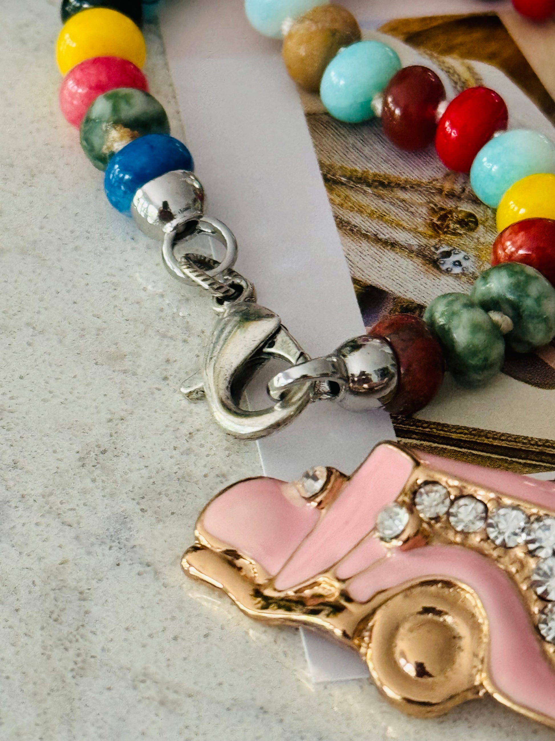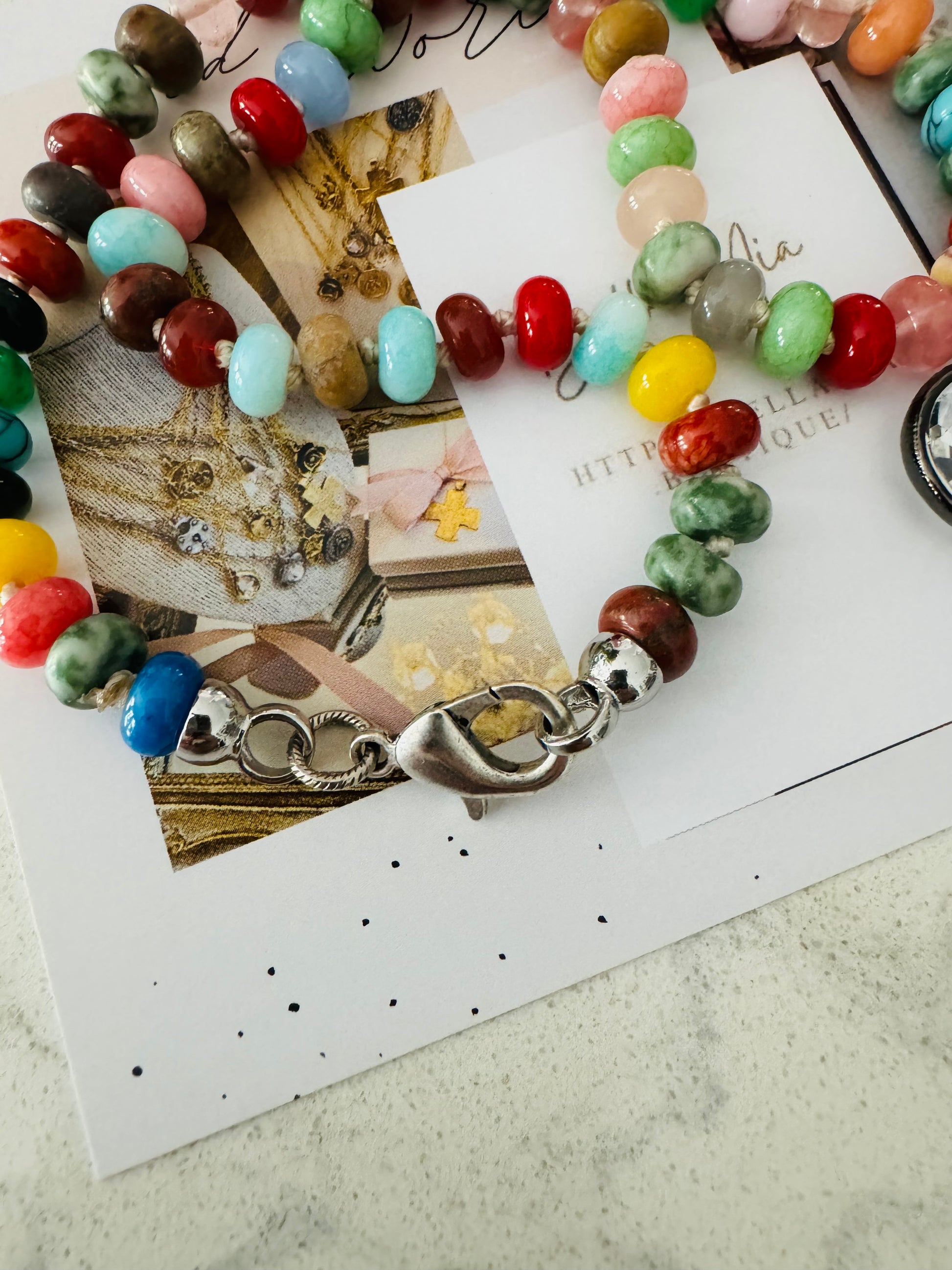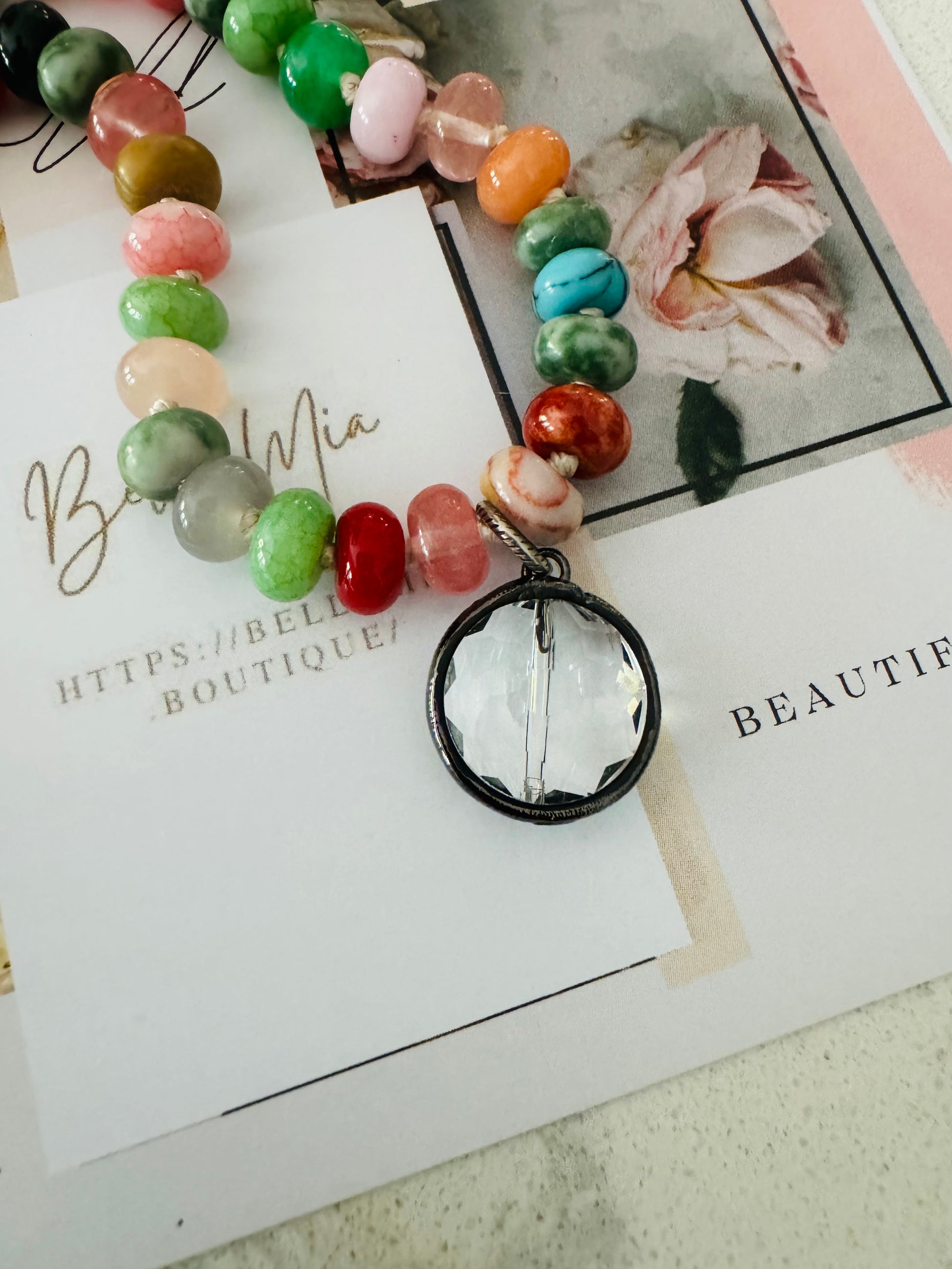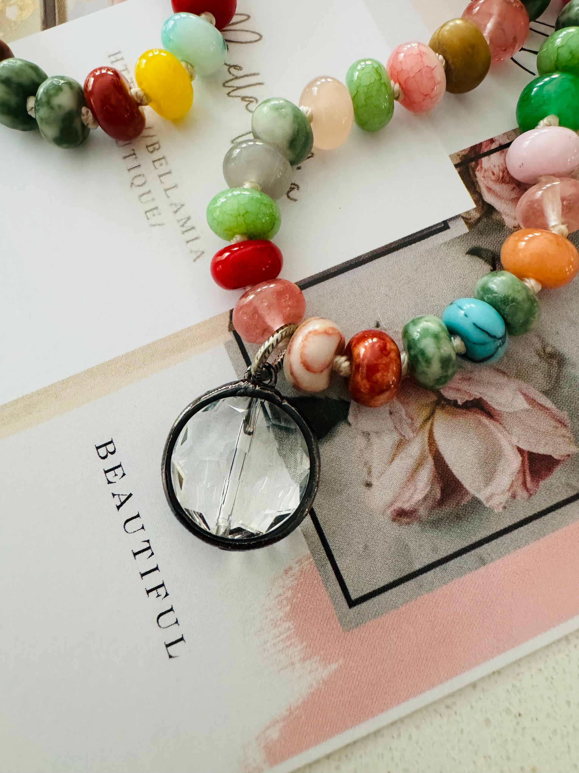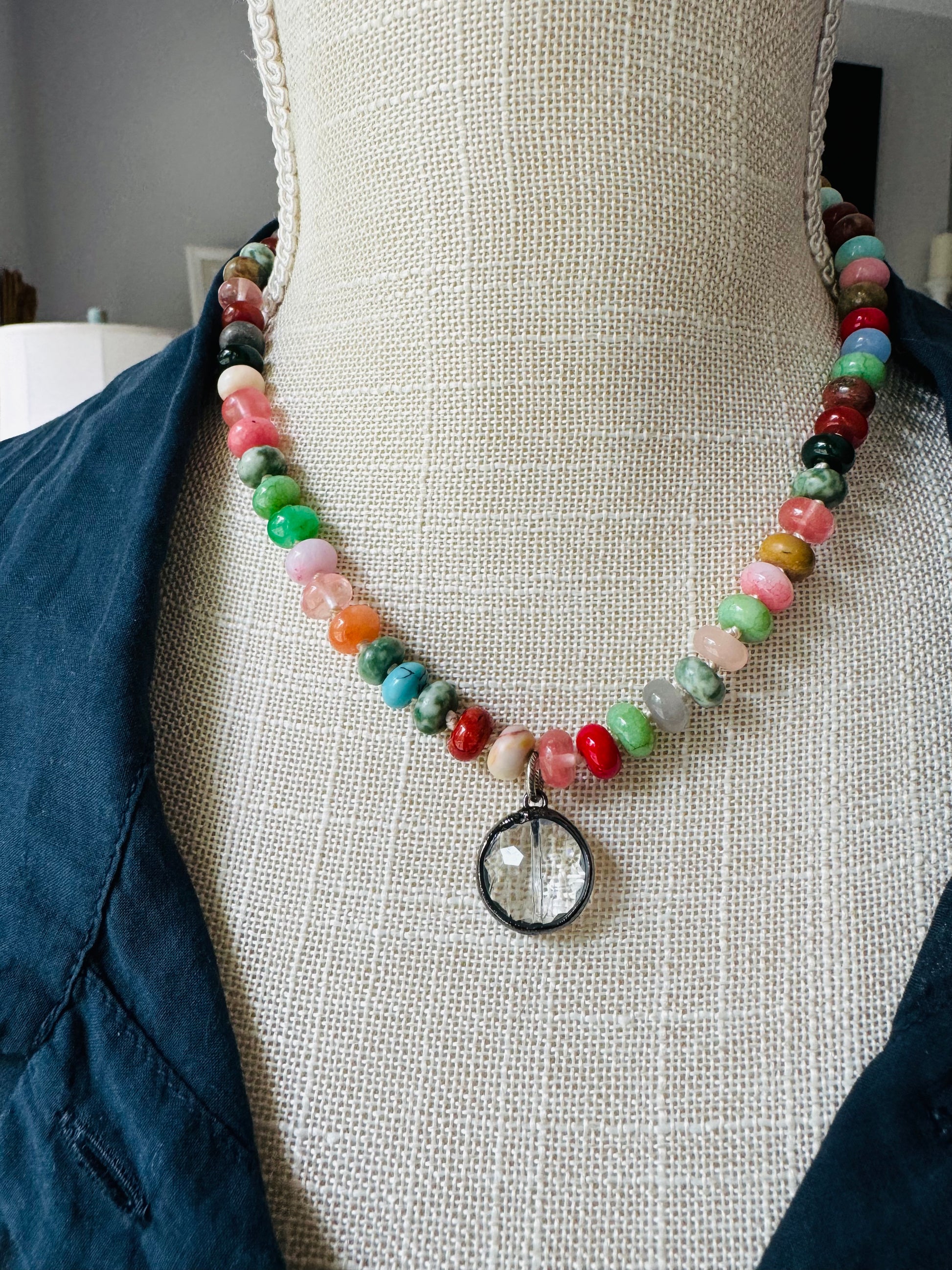 You'll be over the moon with this hand, beaded, colorful, mixed, semi precious 8mm Rondalle stones Featured here with her soldered round crystal pendent.