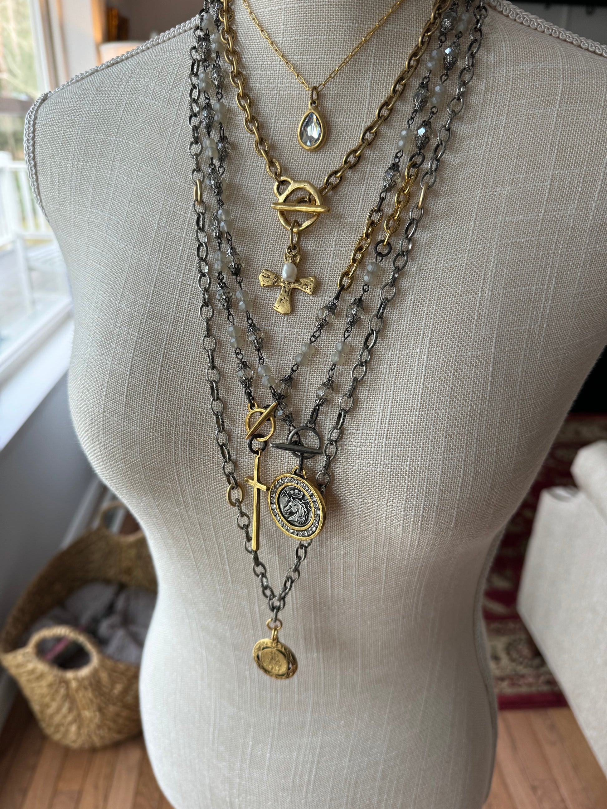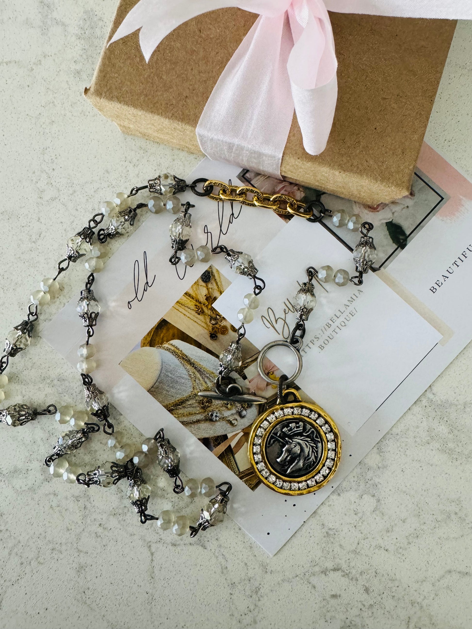 Mixed metal Unicorn Rhinestone pendant necklace with a Rosary gun metal chain turns heads with a Statement Piece!